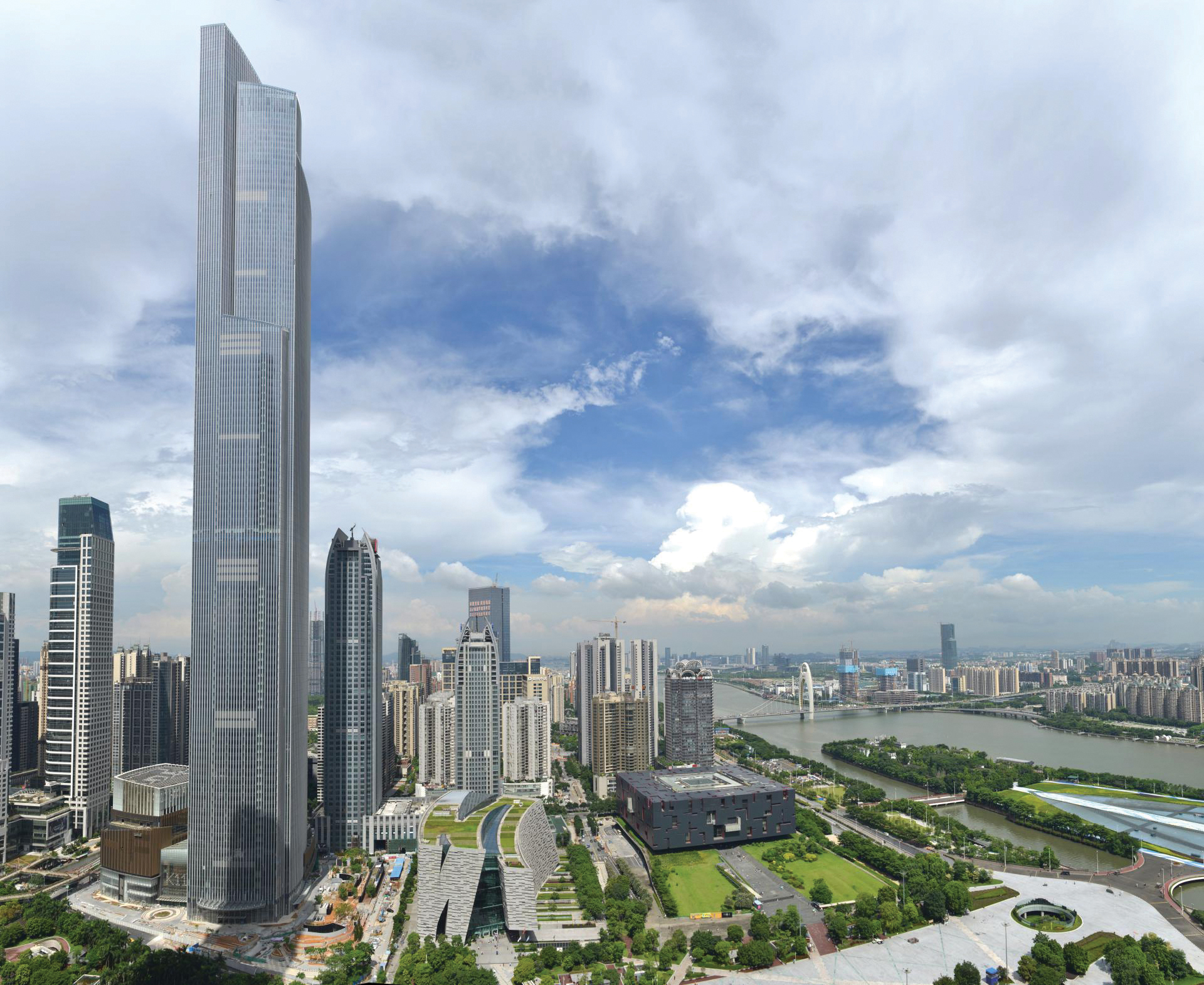 Tai finansų centras (vadinamasis „Rytų bokštas“) Guangdžou mieste, Guangdonge. 111 antžeminių ir penkių požeminių aukštų pastato bendras plotas yra apie 507,7 tūkst. kv. metrų. CTF finansų centrą sudaro dangoraižis ir su juo sujungtas aštuonių aukštų korpusas, kurio 30 m aukščio atrijus užsibaigia stikliniu stogu. Dangoraižį laiko kvadratinė šerdis su 32 m pločio sienomis ir aštuonios milžiniškos betoninės kolonos, kurių ilgis yra 5 m, plotis – 3,5 metro. Jos storesnės, nei įprasta, dėl Kinijos seisminės zonos pavojų. Kolonas jungia atramos ir diržinės santvaros. Dangoraižyje yra iš viso keturių lygių plieninės atramos ir šeši dvigubo sluoksnio diržinių santvarų komplektai. Tarp didžiųjų kolonų yra mažesnės kolonos. Dangoraižio fasadas yra iš stiklo, o vertikalios juostos tarp langų pagamintos iš baltos glazūruotos terakotos. Aliuminio skydai dengia ventiliacijos angas nuo vėjo. Į juos integruoti baltos šviesos diodai naktį apšviečia terakotą. Naudodamas šią medžiagą, architektas Forthas Bagley susiejo architektūrą su vietiniais amatais.