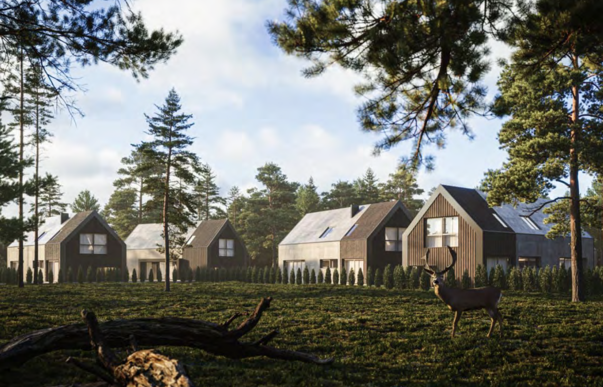 Visame projekte numatyta pastatyti dvylika trumpalaikio apgyvendinimo pastatų. Skirtinguose sklypuose jų išdėstymas varijuoja: dalyje sklypų projektuojama po vieną pastatą, kituose – po du, derinant vieno aukšto ir vieno aukšto su mansarda sprendinius. Toks išdėstymas leidžia išvengti monotonijos, sukuria organišką užstatymo struktūrą ir užtikrina racionalų sklypų panaudojimą.