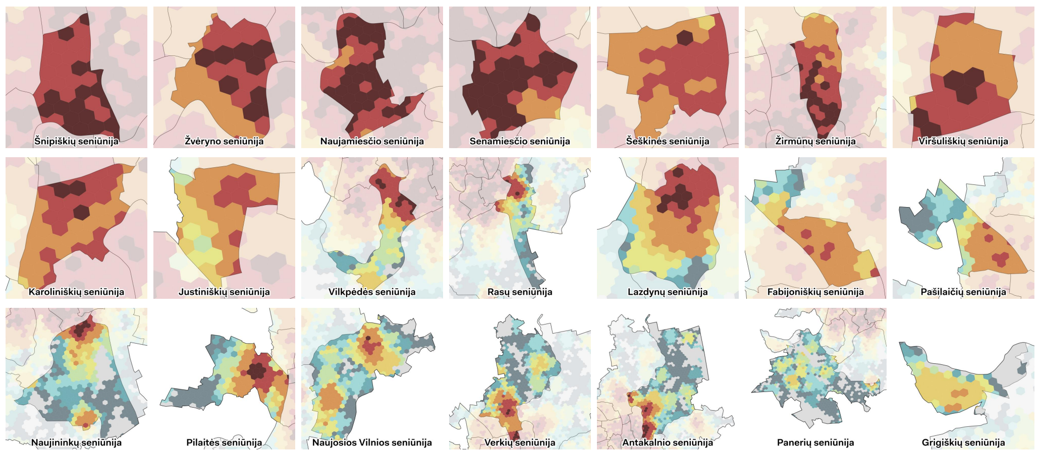 Tokiose seniūnijose kaip Antakalnis, Verkiai, Naujininkai, Rasos ir Vilkpėdė dėl urbanizacijos ir gamtinės aplinkos ypatumų paslaugos išsidėsčiusios netolygiai – daugumą jų sutelktos arčiau miesto centro.
