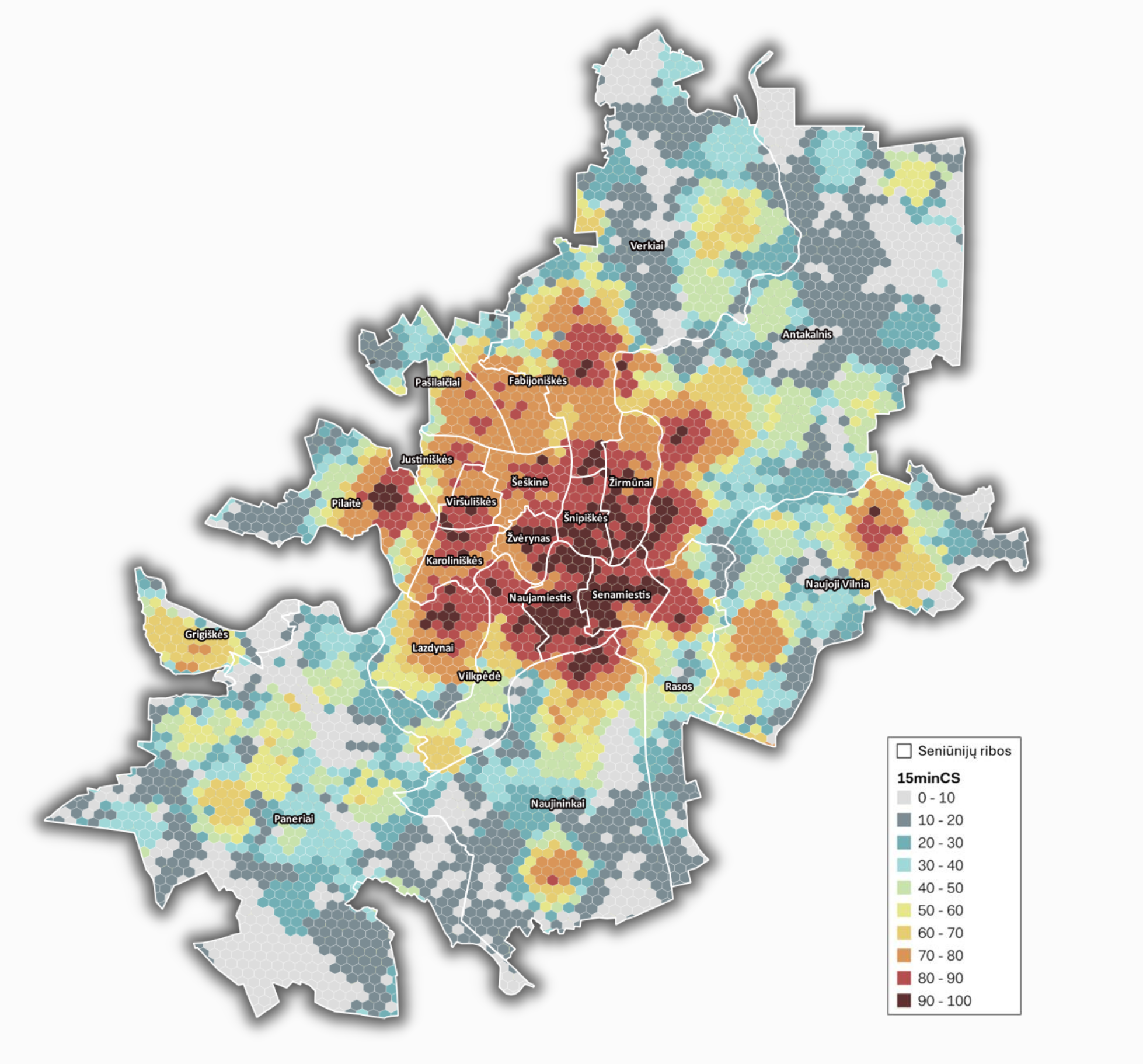 Surinkti duomenys atskleidžia, kad centriniai Vilniaus rajonai – Senamiestis, Naujamiestis, Žvėrynas, Šnipiškės ir Žirmūnai – pasižymi aukščiausiu paslaugų prieinamumo lygiu. Šios vietos jau dabar atitinka 15 minučių miesto principus – jose patogu gyventi, dirbti ir ilsėtis be būtinybės kasdien sėsti į automobilį.