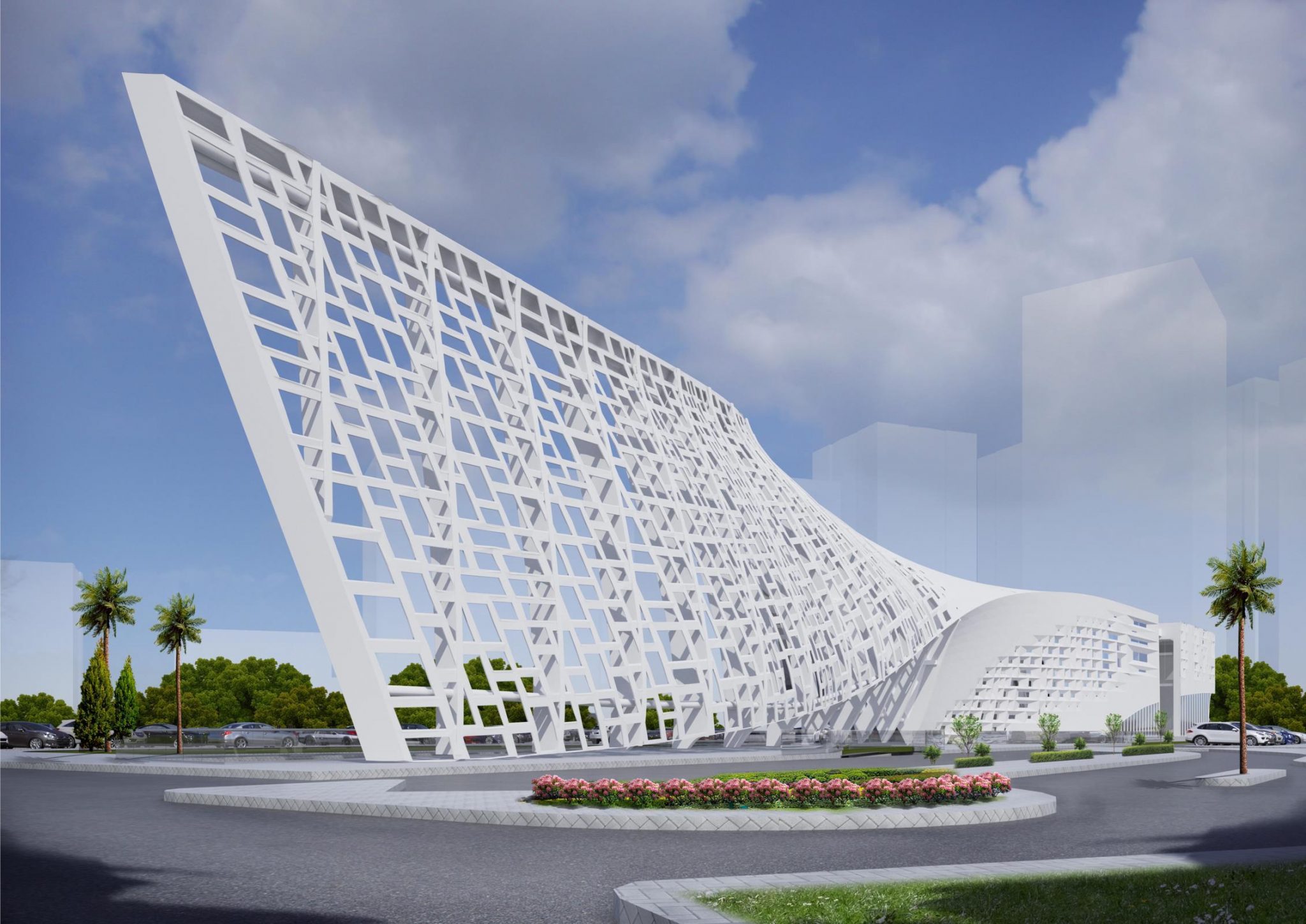 Pastato struktūroje galima įžvelgti perėjimą nuo kieto balto tūrio į šviesų perforuotą paviršių.