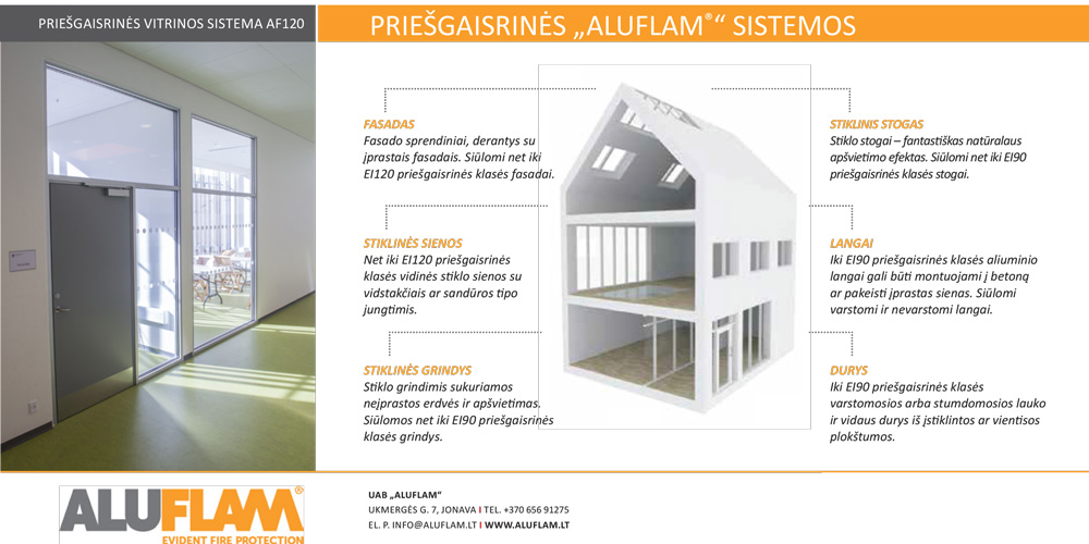 Modernios, inovatyvios priešgaisrinių stiklo ir aliuminio vitrinų, fasadų, durų bei pertvarų konstrukcijų sistemos patenkina ne tik įvairius poreikius, bet atitinka net ateities sprendimus – tai suteikia kūrybos laisvę architektams ir projektuotojams. ALUFLAM® sistemos yra išbandytos notifikuotose laboratorijose ir sertifikuotos Lietuvos gaisrinių tyrimų centre (GTC). Įmonės ekspertai nesileidžia į kompromisus dėl kokybės ir visuomet stengiasi rasti geriausią sprendimą. Nuosavas sistemų ir medžiagų tyrimų bei kūrimo padalinys, taip pat aliuminio profilių ekstrudavimo linijos leidžia sukurti ir pasiūlyti unikalius sprendimus įvairiausiems projektams įgyvendinti.