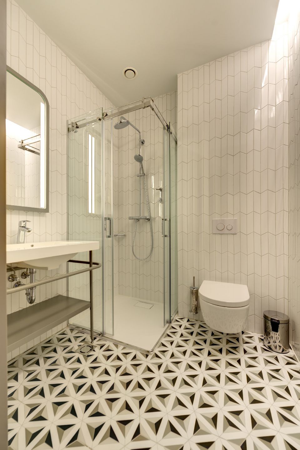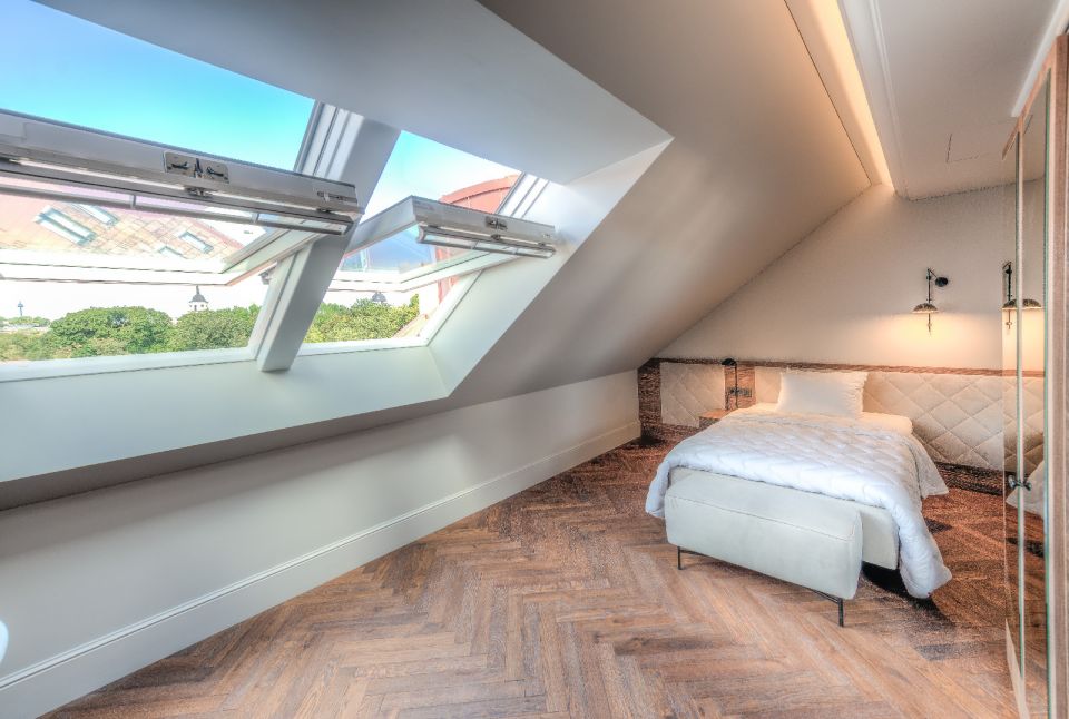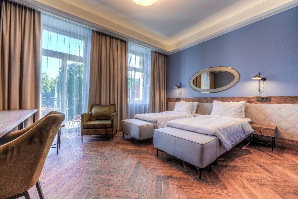 Architektų biuro ABVP architektė V. Vyšniauskienė, kuri su komanda rūpinosi vidaus interjeru, pasakoja, kad viešbučio kambarių plotas įvairus – siekia nuo 23 iki 40 m². „Kambariai didesni tie, kurių langai atsiveria į Gedimino kalną, Bernardinų sodą, į kiemo pusę – mažesni. Tai susiję su laikančiosiomis sienomis, kurių nebuvo galima judinti, – sako architektė. – Pagrindinė viešbučio idėja – maksimalus lankytojo komfortas. Siekėme sukurti stilingus, lakoniškus kambarius, kuriuose būtų ne tik patogu, bet ir jauku.“ Jaukumo jiems suteikė ir minkštieji bendrovės „DesignLAB“, tiekiančios aukštos kokybės visuomeninių erdvių ir individualių namų interjero bei baldų gamybos sprendimus, dviviečiai, triviečiai ir vienviečiai foteliai miegamojo ir svetainės zonoms. Šios įmonės specializacija – industrinio, retro, vintažinio stiliaus baldai, tad ji greitai įgyvendino užsakovo lūkesčius ir padėjo parinkti kokybiškus baldų audinius, gaminius.