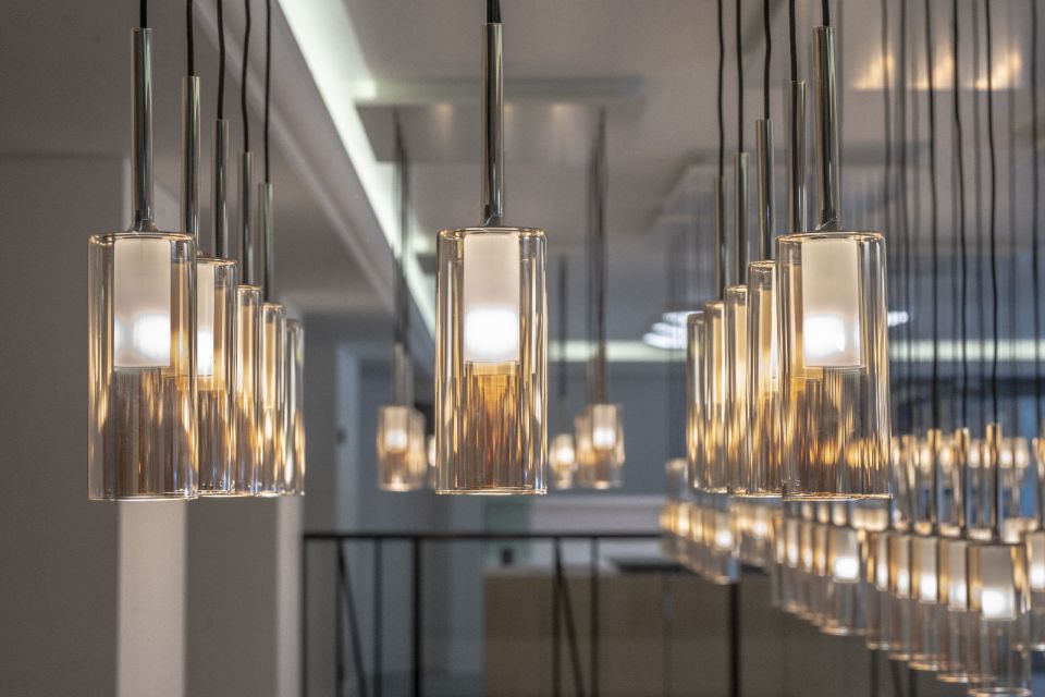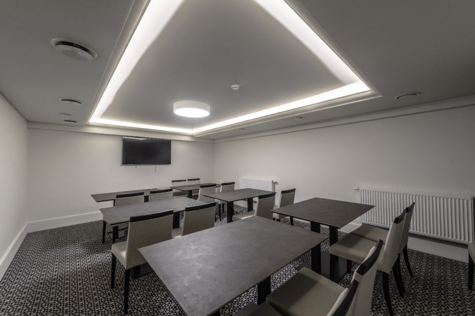Viešbučio koridoriuose parinkta triukšmą sugerianti kiliminė danga, pagaminta specialiai viešbučiui pagal sukurtą piešinį. Visose viešosiose erdvėse, įrengtose cokolyje, – restorane, vestibiulyje, registratūroje – nemažai šiuolaikinio lieto akmens. Šį sprendimą paveikė istoriniai centriniai betoniniai laiptai. Klasikiniam stiliui akcentuoti interjero architektė pasirinko specialiai šiam viešbučiui pagamintas grindjuostes ir apvadus bei poliuretano dekorą paslėptam apšvietimui įrengti. Restorane pasirinktas sugrupuotų šviestuvų kabinimo būdas, kuriantis sietyno iliuziją, naudota paslėpta šviesa, pabrėžianti erdvės pranašumus ir paslepianti trūkumus.
