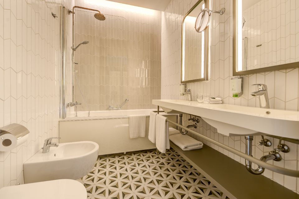 Anot architektės, kambariuose naudota kiek įmanoma daugiau natūralių medžiagų: medžio, akmens, lieto betono. Kambariuose – eglutės rašto ąžuolo parketlentės, vonios patalpose – keraminės plytelės ir t. t. Kompanijos „Grohe“ specialistai prie viešbučio kūrimo prisidėjo vonios kambariams parinkdami komfortiškus vandenį taupančius maišytuvus. Viešbutis „Vilnia“ įsikūręs nuostabioje Vilniaus vietoje ir ta aplinka veikė pasirenkant produktų dizainą, funkcionalumą. „Džiaugiamės užsakovo sprendimu pasirinkti mūsų termostatus tiek voniose, tiek dušuose ir taip užtikrinti maksimalų komfortą prausiantis. Taip pat malonu, kad buvo pasirinktos ir mūsų dušo bei vonios sistemos, kurios leis svečiui džiaugtis didele lietaus ir stipresne rankinio dušelio srovėmis. Praustuvo maišytuvai viešbučio kūrėjų parinkti itin ergonomiški, taupantys vandenį ir labai funkcionalūs. Tai perkamiausias modelis Vokietijoje“, – teigia „Grohe“ pardavimų atstovė Lietuvoje Aistė Stankevičienė.