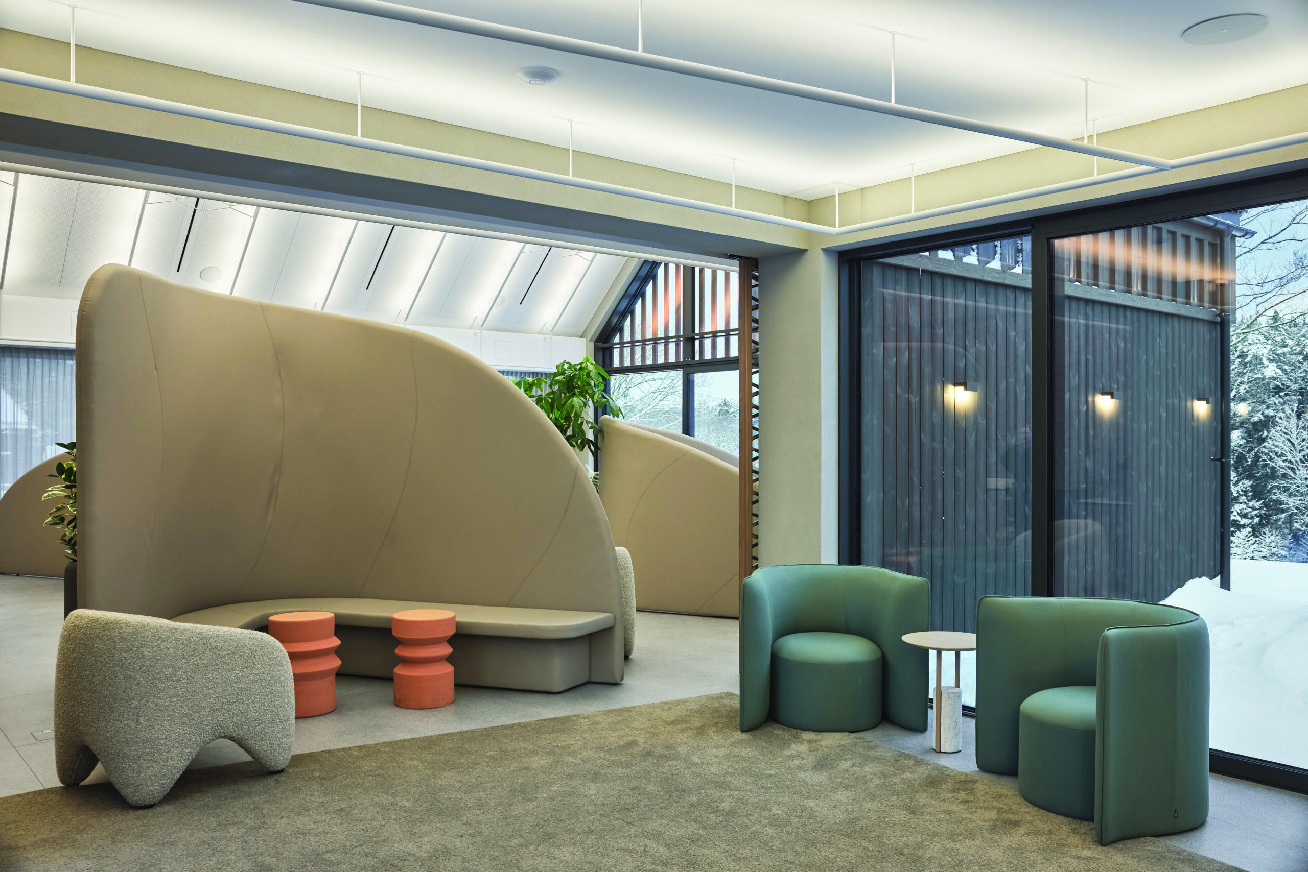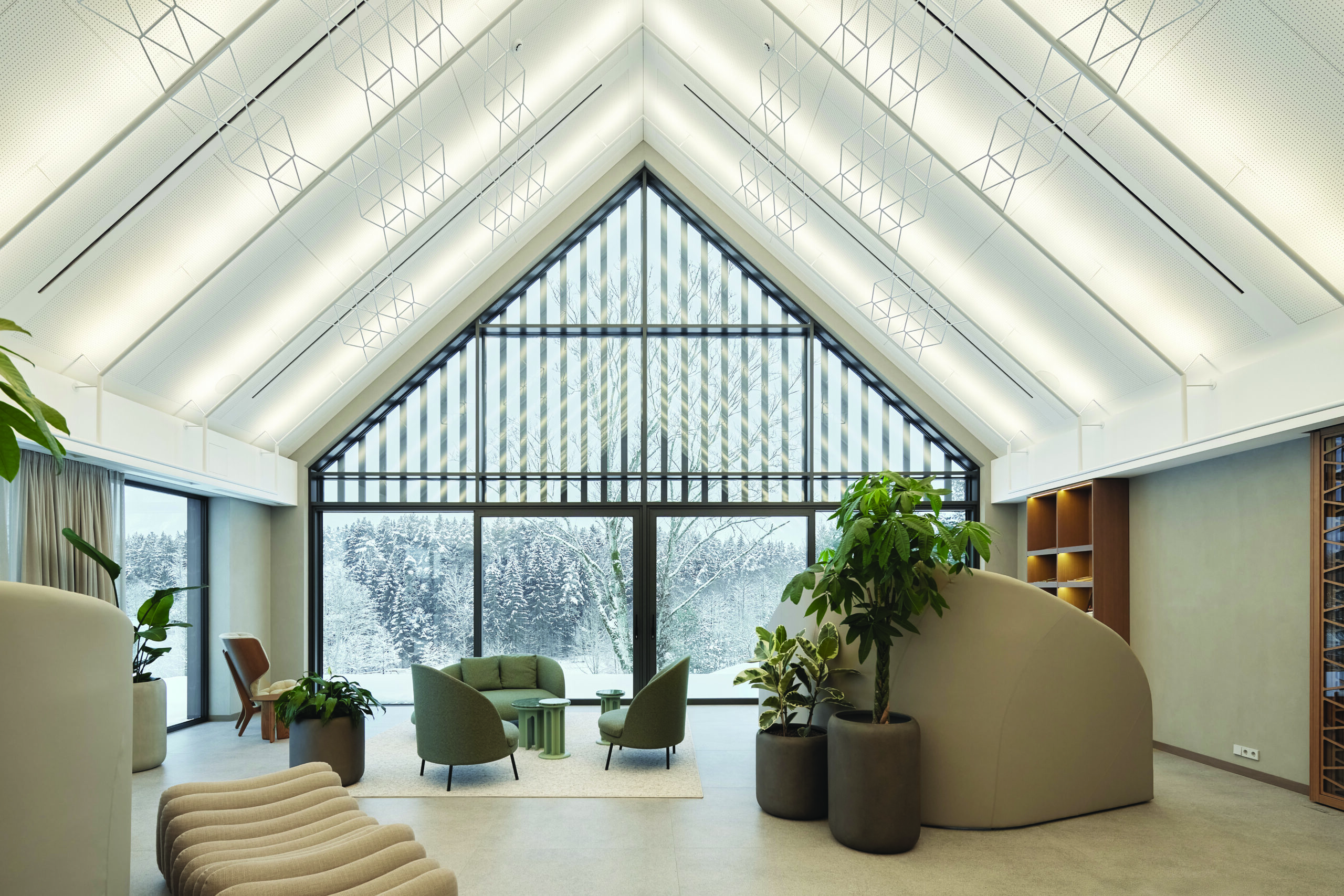 „Šiame interjere nėra meno kūrinių. Čia meniniai objektai išskirtiniai gamtos vaizdai pro langus ir per visą kompleksą atkartojamas autorinis etnopynių motyvas“, – pabrėžia T. Bačiulytė. Pasak architektės, visos skirtingos funkcijos sujungiamos „gamtos koridoriumi“, todėl didžiausias iššūkis buvo numatyti malonius kliento potyrius tiek visais metų laikais, tiek kintančiu paros metu.