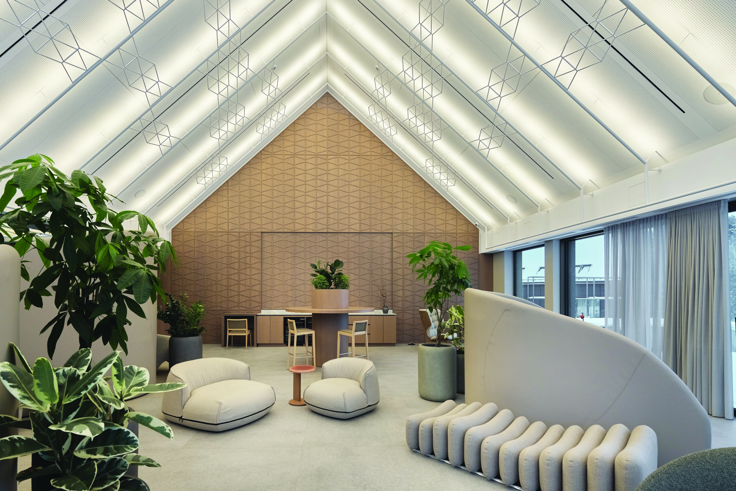 „Šlaitinių viensėdžio lubų dekoratyvinis sprendinys. Šviesa ir šešėlis. Aiški geometrija, tobulai deranti su funkcija, tęsia pasakojimą apie sprendinius antroji „Nomo studijos“ bendrakūrė architektė Lauta Janavičiūtė. – Mūsų suprojektuotos lubos jungia visus techninius sprendinius (ŠVOK elementus, akustiką, apšvietimą, struktūrą, ant kurios galima kabinti papildomus dekoratyvinius elementus kiekviena proga). Pagrindinis projekto leitmotyvas atkartojamas vis kitaip – jis tai ištirpsta lubose, tai yra išryškinamas šešėliais. O štai restorano lubose atkartojome supančių šlaitų vingius, neatsitiktinai ten yra ir šviestuvai-žolynai: jie – pievų atspindys.“
