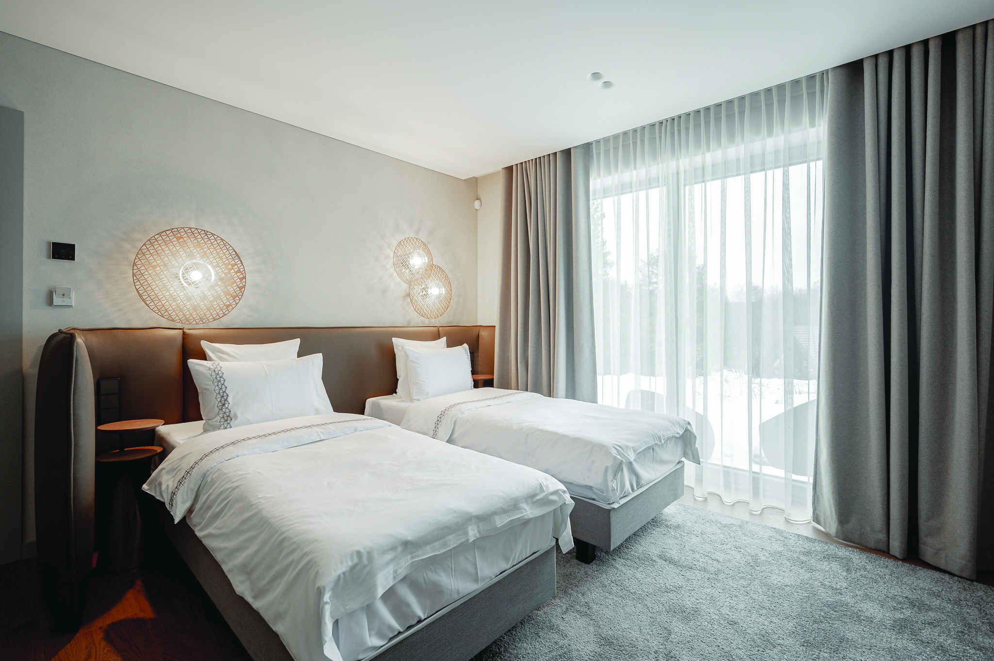 Viešbučio kambariuose sumontuotos dieninės užuolaidos kartu su naktinėmis blackoutužuolaidomis, užtikrinančiomis 100 proc. patalpos užtamsinimą ir komfortiškas poilsio sąlygas. Daugumoje vonios kambarių ant varstomų langų iki grindų sumontuotos siauros 25 mm medinės žaliuzės. Natūrali bambuko mediena suteikia interjerui šilumos, o žaliuzių konstrukcija leidžia tiksliai reguliuoti šviesos kiekį ir privatumo lygį.