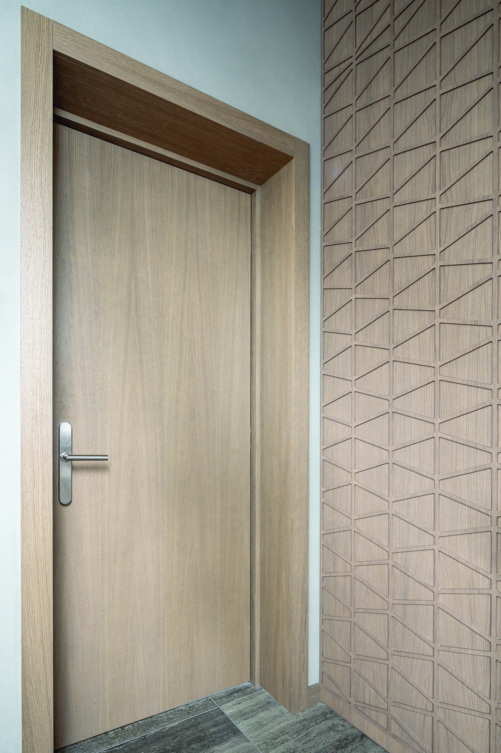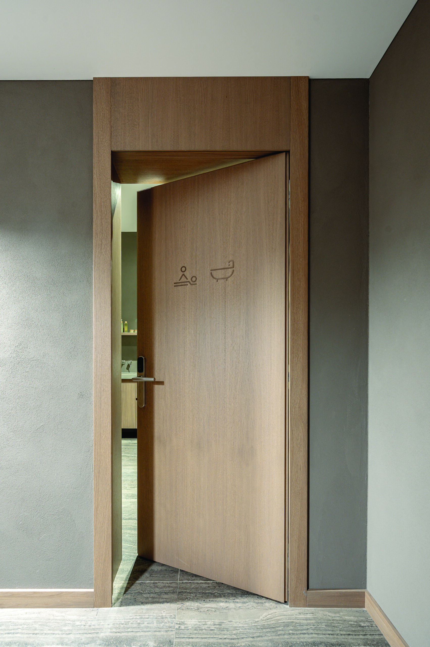 SPA ir bendrosiose rezidencijos patalpose sumontuotos tvirtos ąžuolinės durys. Jų nesikartojantis, unikalus medienos raštas suteikia interjerui solidumo ir jaukumo. Beje, šiame projekte išskirtiniai ne tik durų reljefai, spalvos ir konstrukcijos – netipiniai ir pagal individualų projektą pagaminti jų apvadai bei grindjuostės.
