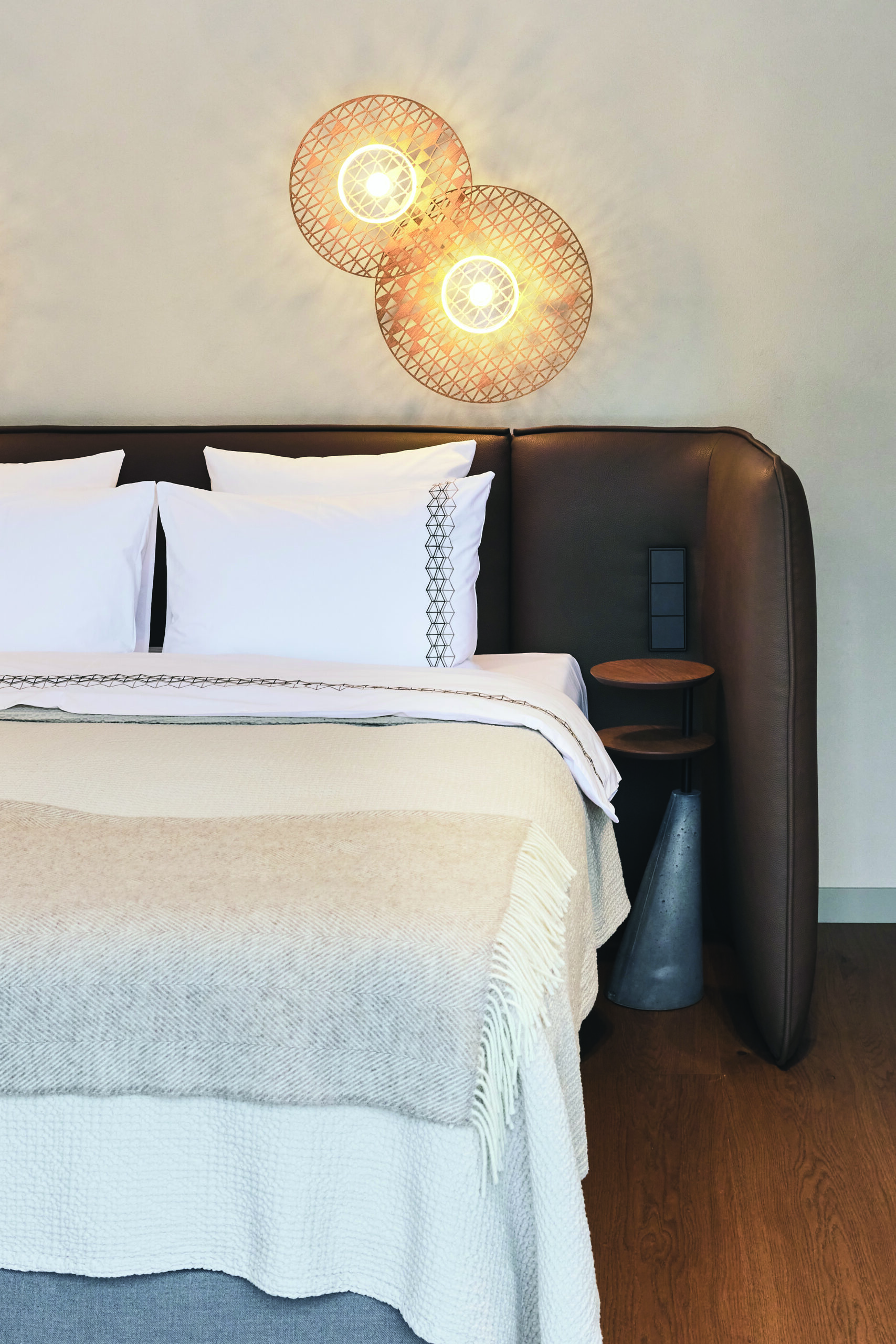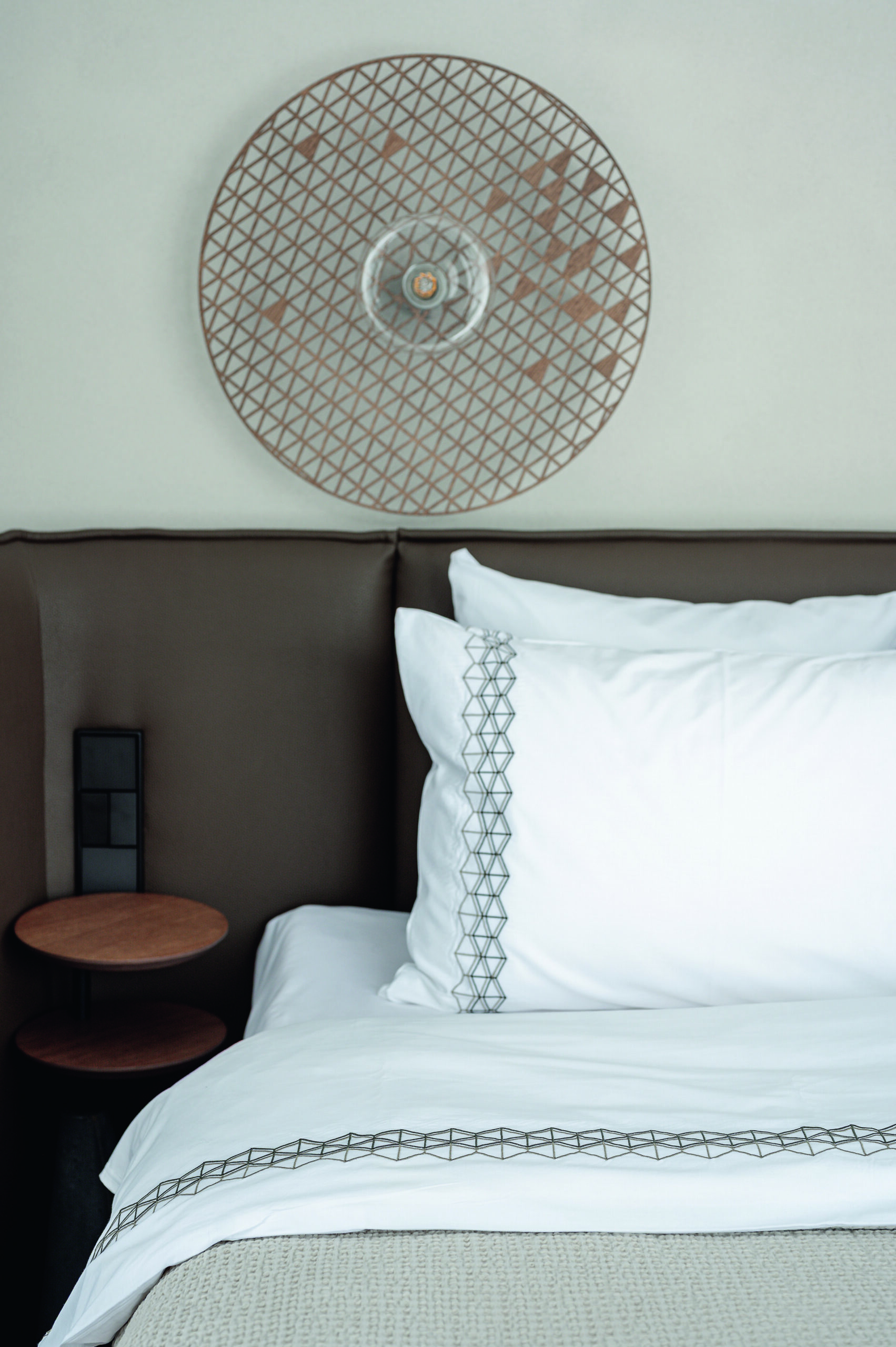 Užsakovo pageidavimu patalynė, rankšluosčiai ir chalatai buvo individualizuoti – išsiuvinėti interjere atsikartojančiais motyvais. Tekstilės detalės tapo ne tik funkciniu, bet ir estetiniu elementu, stiprinančiu rezidencijos identitetą.