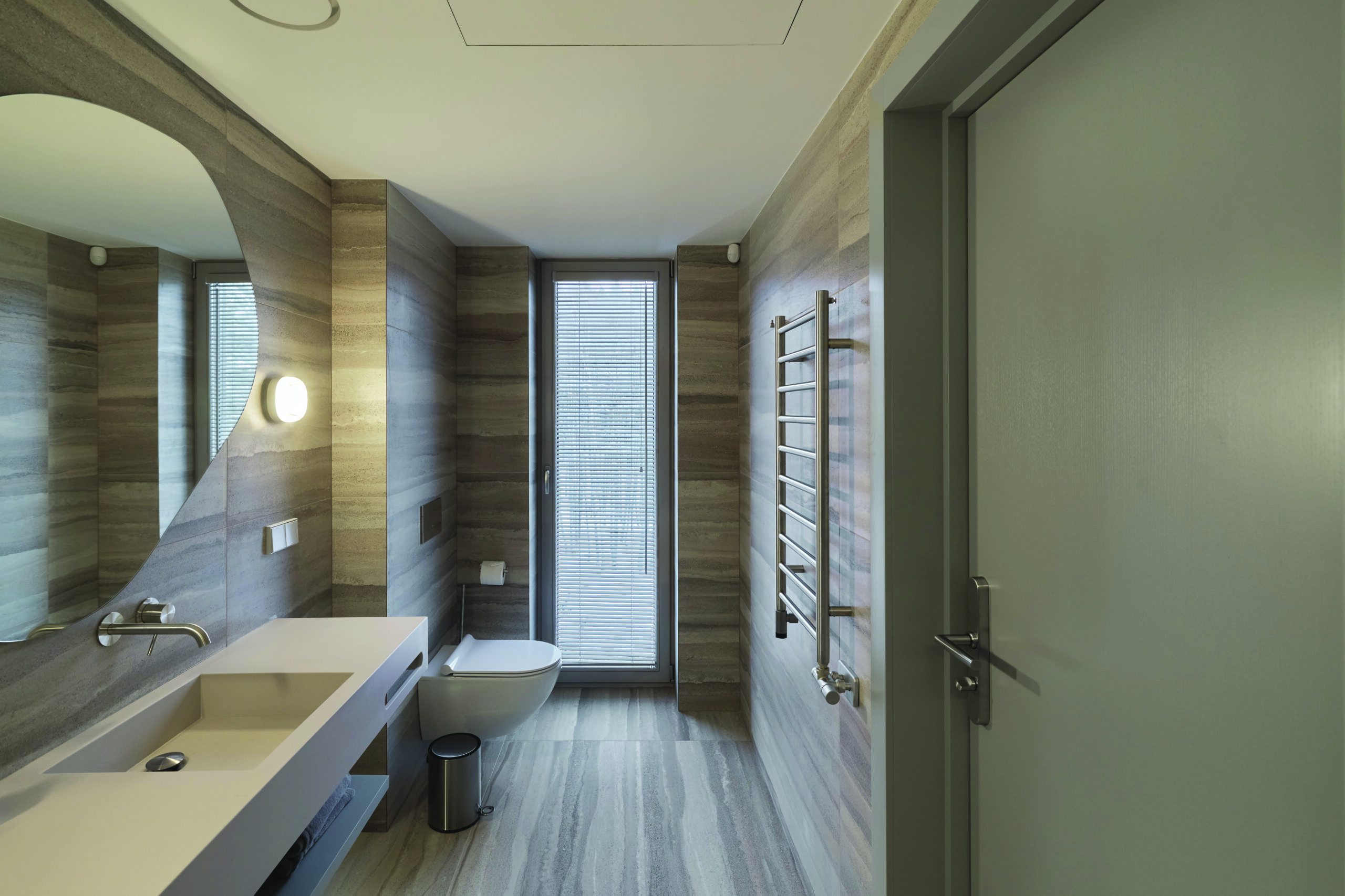 Parinktos individualaus dydžio dušo kabinos su 10 mm grūdintu stiklu ir prieškalkine (anti-limescale) danga. Stiklui sandarinti naudotos magnetinės tarpinės su nerūdijančiojo plieno profiliu – skirtingai nei silikoniniai elementai, jos negelsta ir neišsikraipo. Visi profiliai, vyriai, rankenos ir aksesuarai – taip pat iš nerūdijančiojo plieno. Objektui parinkti ir nerūdijančiojo plieno radiatoriai.