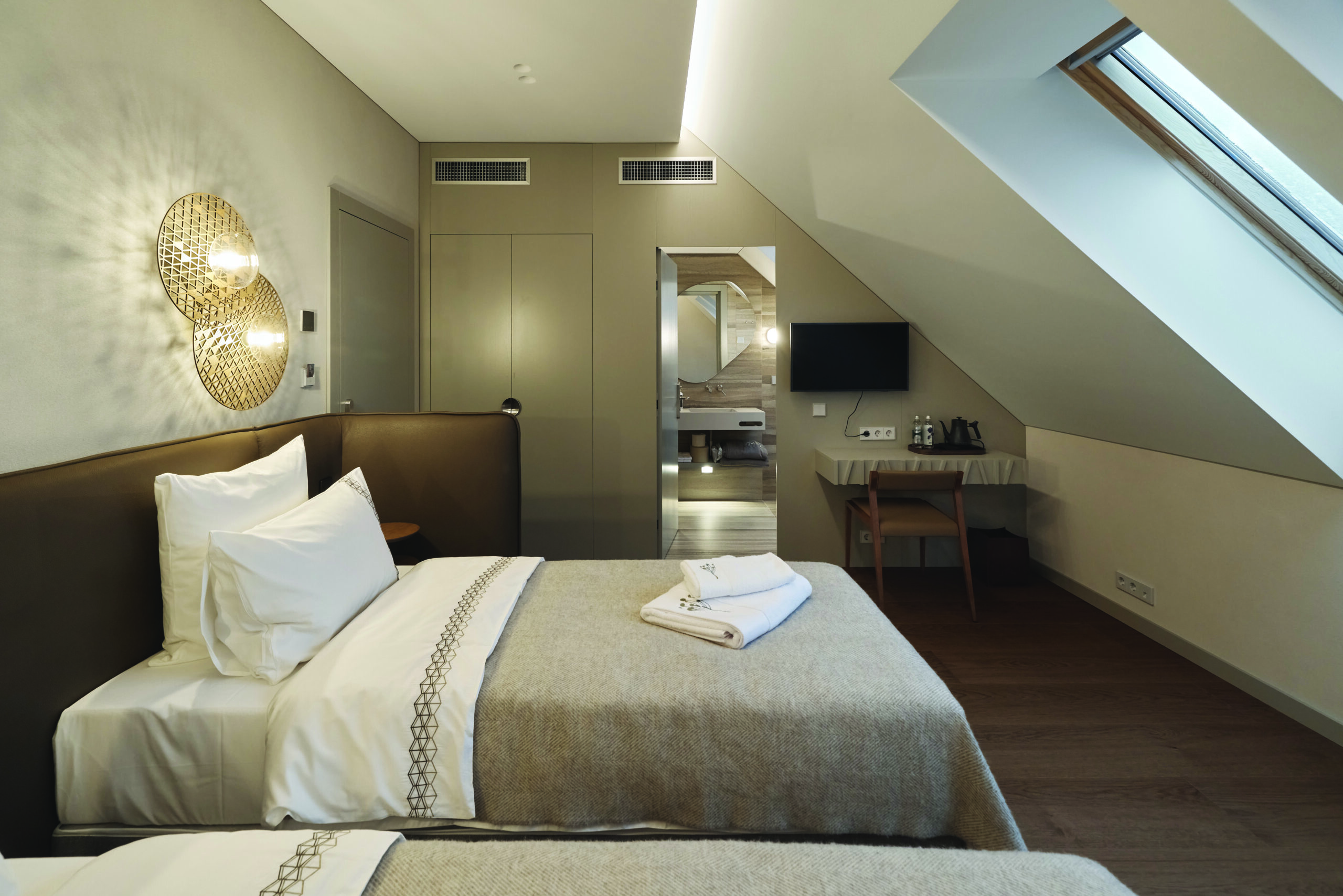 Vienas esminių projekto sprendimų – visuose kambariuose įgyvendinta vieninga miego sistema, kurios pagrindas – ergonominių čiužinių TEMPUR® dermė su reguliuojamomis lovomis „Hollandia“. Galimybė individualiai reguliuoti gulėjimo padėtį bei prisitaikyti lovą pagal asmeninius poreikius ženkliai pagerina rezidencijos svečių komfortą.