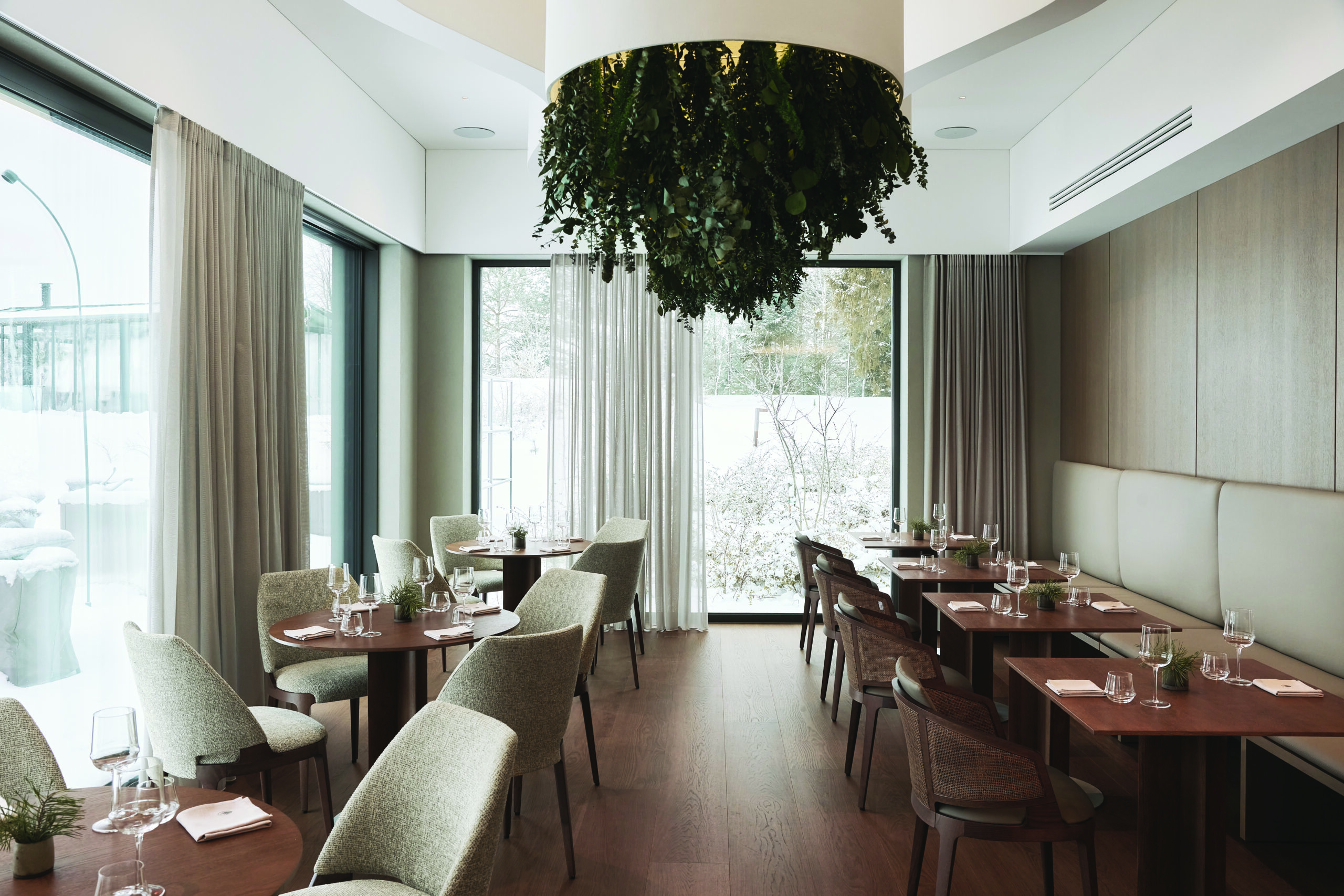 Išskirtinis kraštovaizdis įpareigojo kūrėjas laikytis natūralumo estetikos gamtinių, organiškų pustonių, malonių liesti paviršių, todėl pasirinktos natūralios medžiagos (ąžuolo, granito, plieno) ir subalansuota jų tarpusavio dermė. Komplekse naudojamos plytelės neatsitiktinai primena tektoninius žemės pjūvius: jų horizontalus sluoksniškumas dera prie šlaitų, matomų pro langus. Kaip papildoma pustonių dimensija pasitelkti šviesos ir šešėlių kuriami sluoksniai, atsirandantys šviečiant per atkartojamą dekoratyvinį miškų ir šlaitų motyvą.