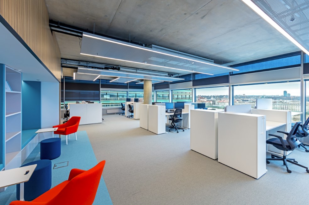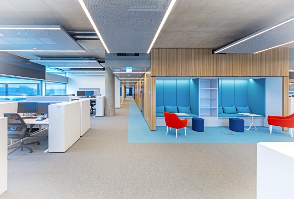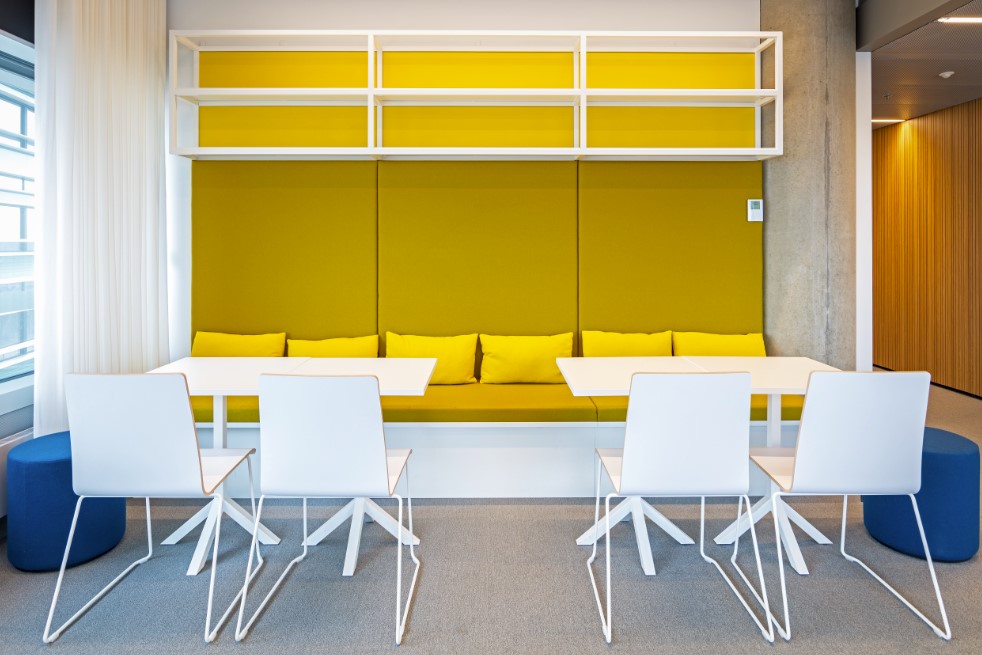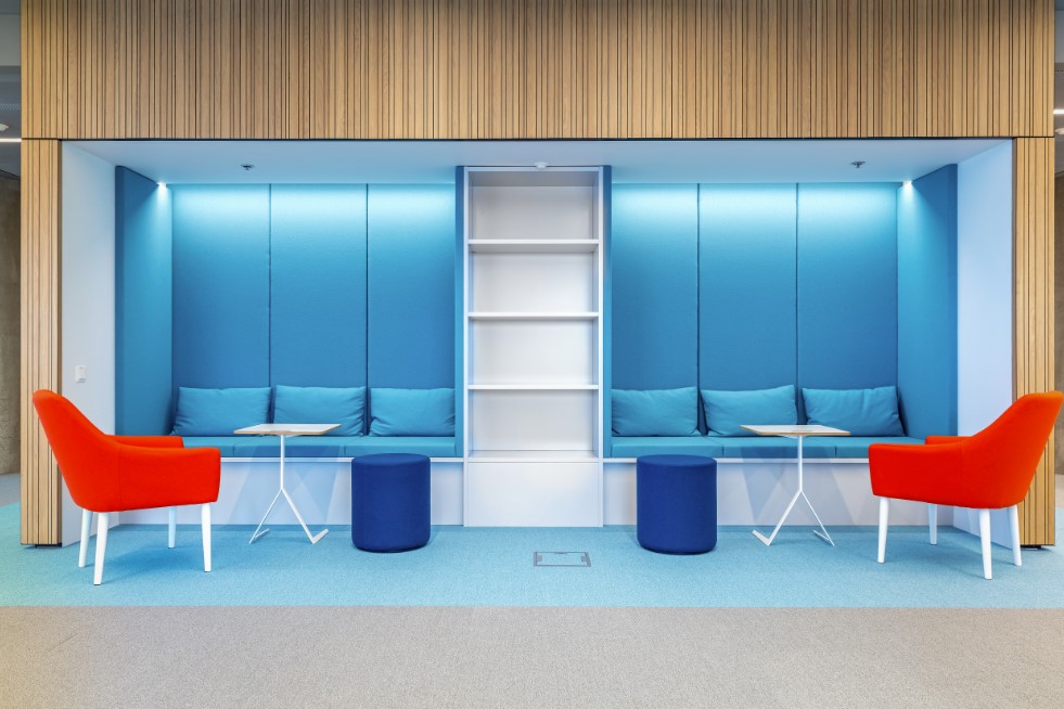 Poilsio vietos su minkštasuoliais ir pagalvėlėmis įrengtos nedidelėse sieninėse nišose priešais darbo erdvę. Tai vienu metu padeda ir atsiriboti nuo aplinkos garsų, ir prireikus matyti, kuo užsiima dirbantys kolegos. Poilsio zonose stovi ir kavos staliukai bei lengvi, mobilūs pufai, pagyvinantys šią erdvę.