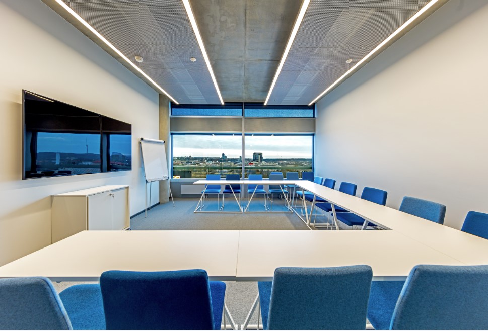 Na, o konferencijų salė ir pasitarimų kambarys yra atskirti nuo darbo ir poilsio erdvių. Konferencijos ir pasitarimai vyksta prie funkcionalių stalų, sėdint ant funkcionalių kėdžių. Prireikus taupyti plotą, kėdės iki penkių vienetų gali būti sudedamos viena ant kitos.