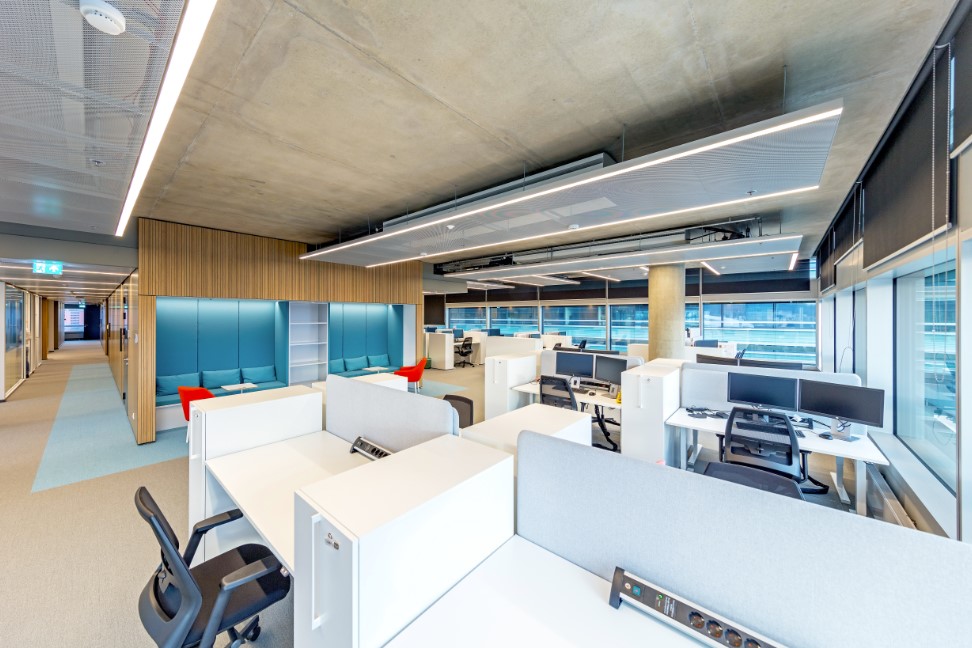 Darbo stalai pagaminti pagal „sėsk ir stok“ sistemą. Tai elektra reguliuojamo aukščio stalai, vienu mygtuko paspaudimu keičiantys aukštį nuo 70,5 iki 120,5 centimetro. Taip darbo vieta tampa ne tik ergonomiška, bet ir dinamiška, galimybė keisti padėtį iš sėdimos į stovimą išjudina ir kūną, ir mintis, o tai garantuoja produktyvesnį darbą. Šalia darbo vietų pastatytos ir patogios daiktadėžės.