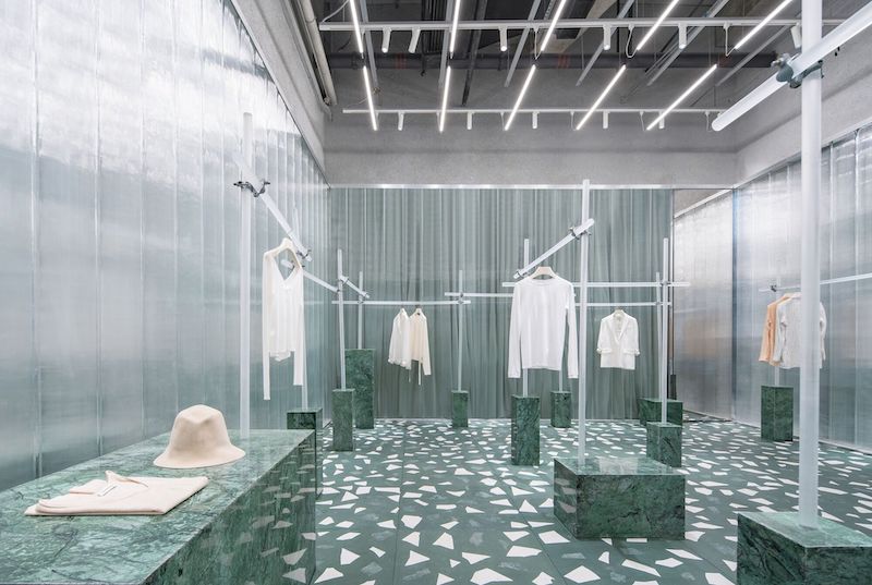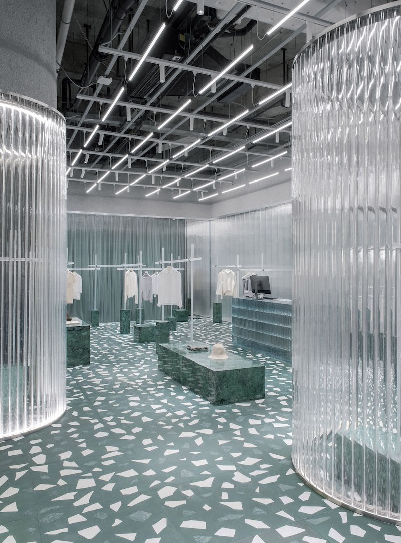 Stiklo plytos – ledo karalystės iliuzija. Ar pamenate mokyklos sienas, sumūrytas iš stiklo blokelių? Seniau jie būdavo perskirti tinko, o šiuo metu technologijos leidžia sukurti vientisą stiklo plytų sieną ar darbastalį, kuris neabejotinai tampa pagrindiniu erdvės akcentu. Portalas „designboom.com“ aprašo Kinijoje sukurtos minimalistinių drabužių moterims parduotuvės „Geijoeng“ interjerą, kuriame tiek grindims, tiek kasos baldui panaudotos įvairaus dydžio stiklo plytos. Interjerą kūrė „Studio 10“ dizaineriai, derindami permatomas sienų ir grindų plytas, stiklo sienas ir derančio atspalvio užuolaidą už stiklo pertvaros.