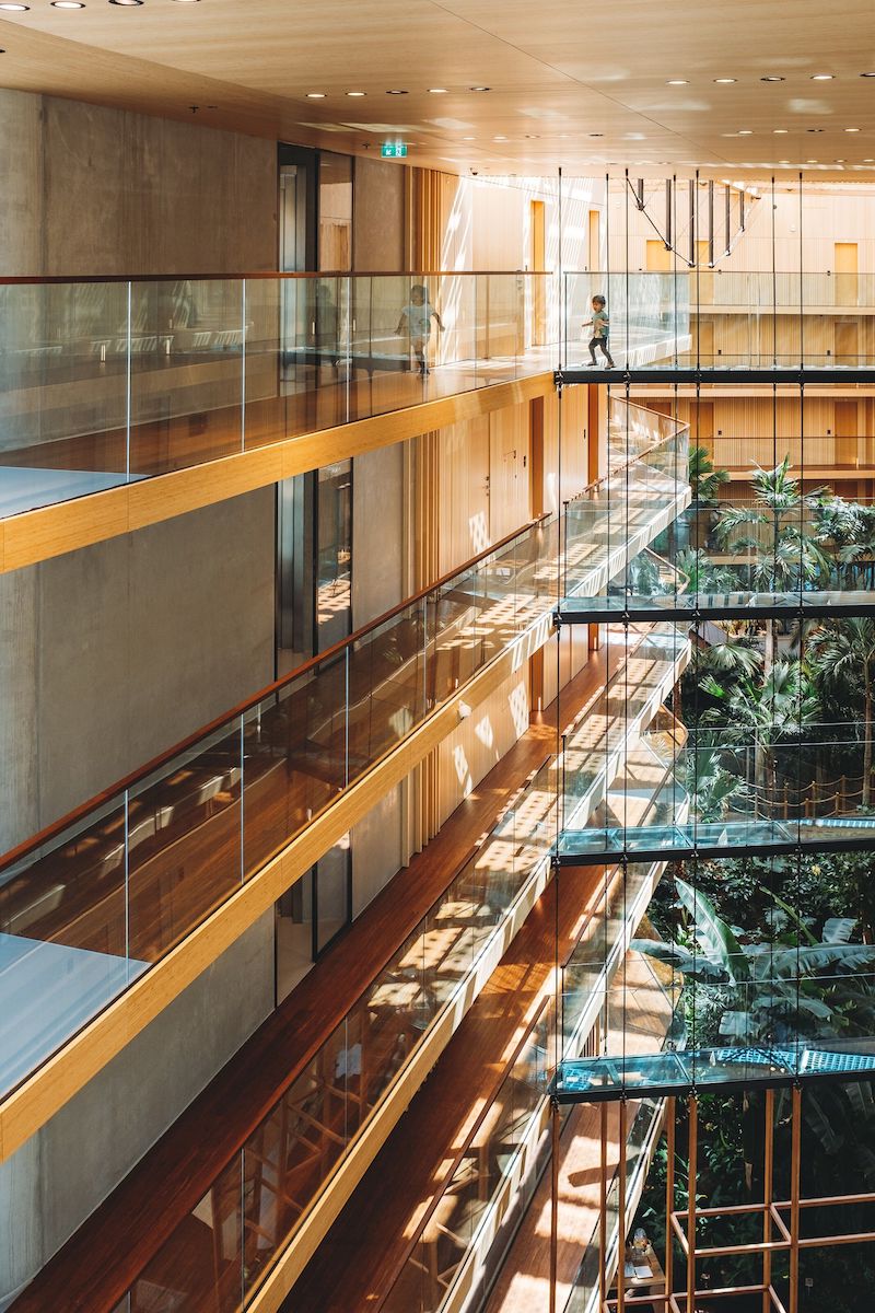 Kiaurai žemyn ir kiaurai aukštyn. Kai stiklą pasidarė įmanoma sutvirtinti, laminuoti, pagaminti atsparų karščiui, kartu atsirado ir galimybė jį naudoti grindims. Pavyzdžiui, įstiklinti dalį antrojo aukšto grindų. Tai padidina galimybes kristi šviesai, dizaineriams tampa būdu pratęsti erdvę ir galbūt net antrajame aukšte įrengti elementą, kuris būtų puikiai matomas būnant pirmajame ir žvelgiant aukštyn.