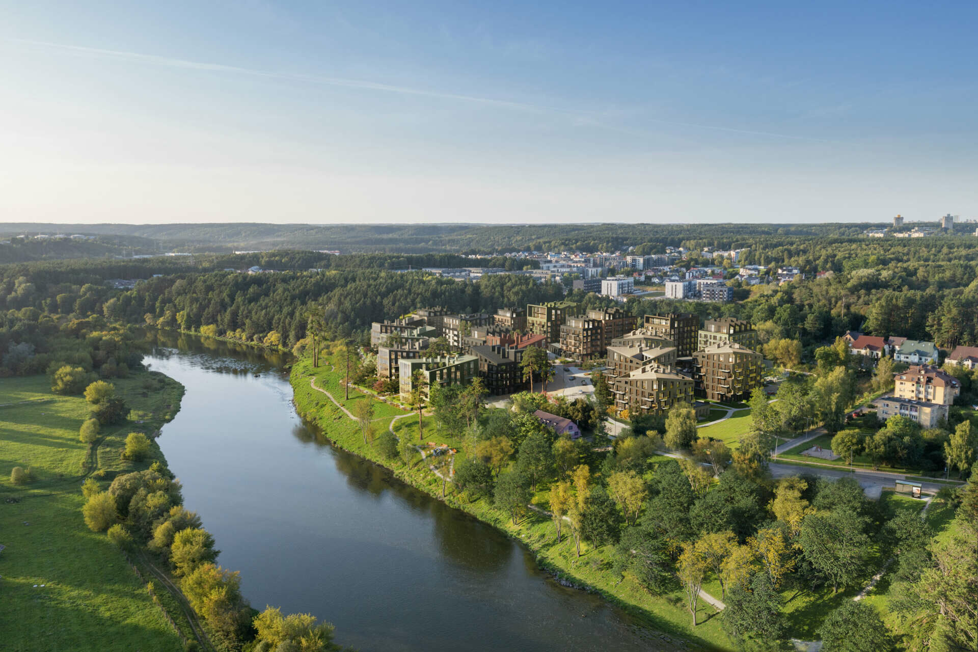 Iš kvartalo suplanuoti patogūs nusileidimai, apšvietimas, takai link upės ir toliau į miško pusę. Pakrantė bus paliekama atvira – neapsodinama aukštais medžiais, kad iš takų ir dalies namų būtų galima matyti upės vagą. Šalia upės ir miško suplanuoti pasivaikščiojimų takai, suoliukai, vietos poilsiui.