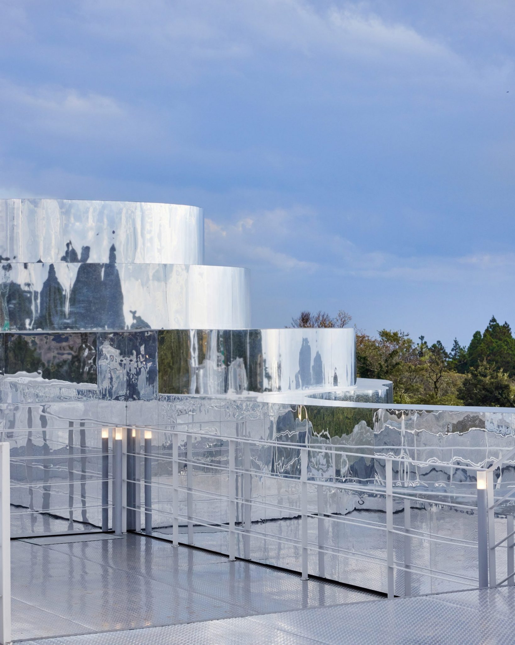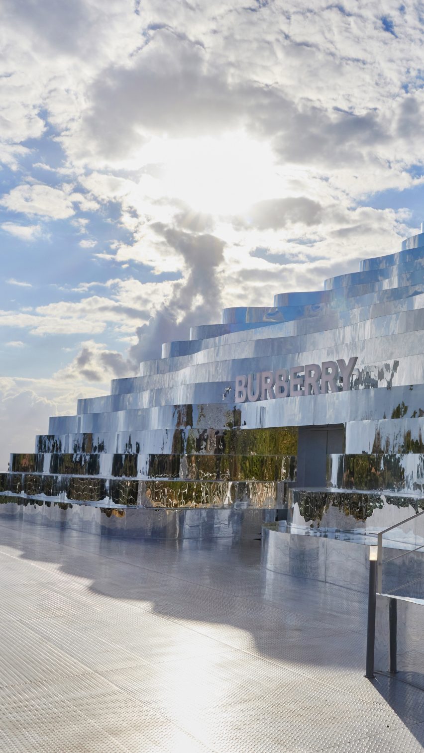 Britų mados prekės ženklas „Burberry“ savo naujausiai viršutinių drabužių kolekcijai įrengė laikiną veidrodinę parduotuvę, atspindinčią aplinkines kalnų grandines Čedžu saloje, Pietų Korėjoje.