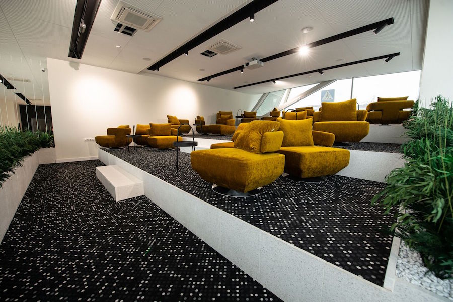 Gaminant baldus naudotas švediškas audinys, diodams uždengti – kompozitas. Taip pat individualiai šiam baldui buvo ruošiamos metalinės kojos, dažytos milteliniu būdu, užsakomi nestandartinio dydžio faneros lapai, spausdinami šablonai pjovimams lanku. Be to, kiekvieną gaminį reikėjo atskirai transportuoti į vietą. Gautas rezultatas – unikalus mūsų šaliai. Minkštasis baldas „Business Stadium West“ patalpose išskirtinis tiek dydžiu, tiek sprendimais ir tokio kito Lietuvoje rasti kol kas neįmanoma.
