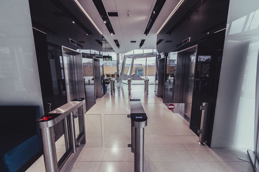 Svarbu paminėti, kad modernia įėjimo kontrolės sistema rūpinosi novatoriška įmonė UAB „nSoft“, šiame objekte integravusi praėjimo kontrolės vartelius bei praėjimo kontrolės skaitytuvus – brūkšninių kodų ir RFID (nuotolinių kortelių). Anot „nSoft“ specialistų, šis projektas buvo ypač įdomus dizaino sprendimais – nuskaitymo įranga turėjo būti paslėpta vartelių korpuse, dizainas priderintas prie aplinkos. Todėl visi skaitytuvai integruoti į gaminį, dengti juodu stiklu, brūkšninis kodas nuskaitomas nuo to paties paviršiaus kaip ir praėjimo kontrolės kortelė. Viskas tam, kad būtų sukurtas estetiškas vaizdas, o rezultatas atitiktų A+ biurų klasės reikalavimus. Taip pat visiškai netradicinis sprendimas, kad įveikiant kontrolės punktus nuskaitomos ir darbuotojų kortelės, ir svečių leidimų brūkšniniai kodai, kuriuos svečias, atvykęs į verslo centrą, išsispausdina savitarnos terminale.