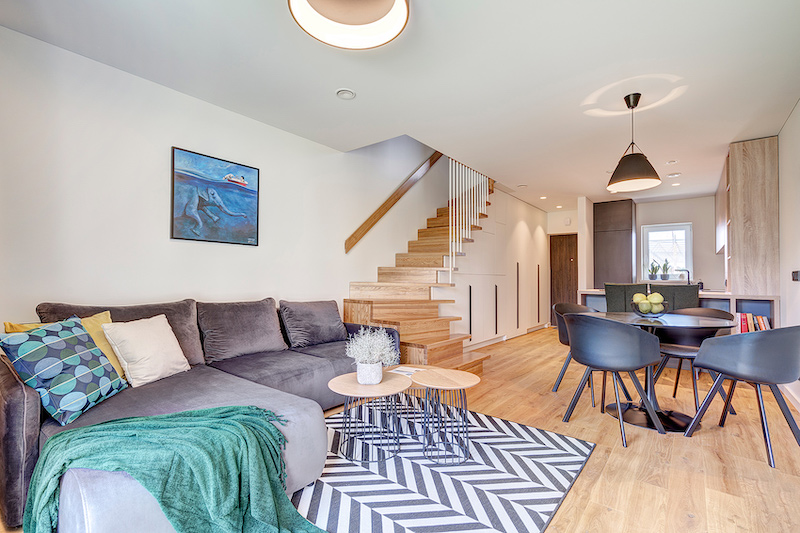Interjero su vidiniais laiptais kūrimas prasideda nuo funkcinių zonų paskirstymo. Demonstraciniame bute dizaineriai nuėjo klasikiniu keliu – virtuvė ir svetainė pirmame aukšte, tėvų ir vaikų miegamieji antrame. Tačiau jokių griežtų taisyklių nėra. Net ir pirmame aukšte virtuvės zoną galima sukeisti su svetainės, virtuvę perkelti arčiau lango ir išėjimo į terasą, jei tik pagal gyvenimo būdą taip bus patogiau.