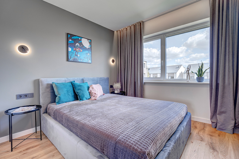Pasak dizainerių, tai, kad siekiant sukurti didesnės erdvės pojūtį reikia naudoti kuo daugiau baltos spalvos, yra mitas. „Rinkome kontrastingas spalvas, nuo baltos iki juodos. Pernelyg balti interjerai prarandą jaukumą ir šilumą. Juodos mūsų interjere taip pat nėra daug, ją naudojome kaip grafišką akcentą, parinkdami juodus jungiklius, baldų rankenėles, kitas detales. Kūrėme minimalistinį, tačiau tuo pat metu gyvybingą interjerą. Kvartalas stovi apsuptas natūralios gamtos, netoli Gelūžės ežero,todėl viduje atsirado medžio spalvos, faktūros: – natūralaus ąžuolo parketlentės, imituojančios lentų grindis, medžio spalvos stalviršis tamsiai pilkoje virtuvėje, žalsvos pagalvėlės svetainėje, trijų atspalvių žalsvos, eglute klijuotos sienų plytelės vonios kambaryje,“ – pasakojo K. Mikšys.
