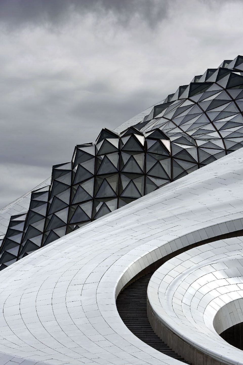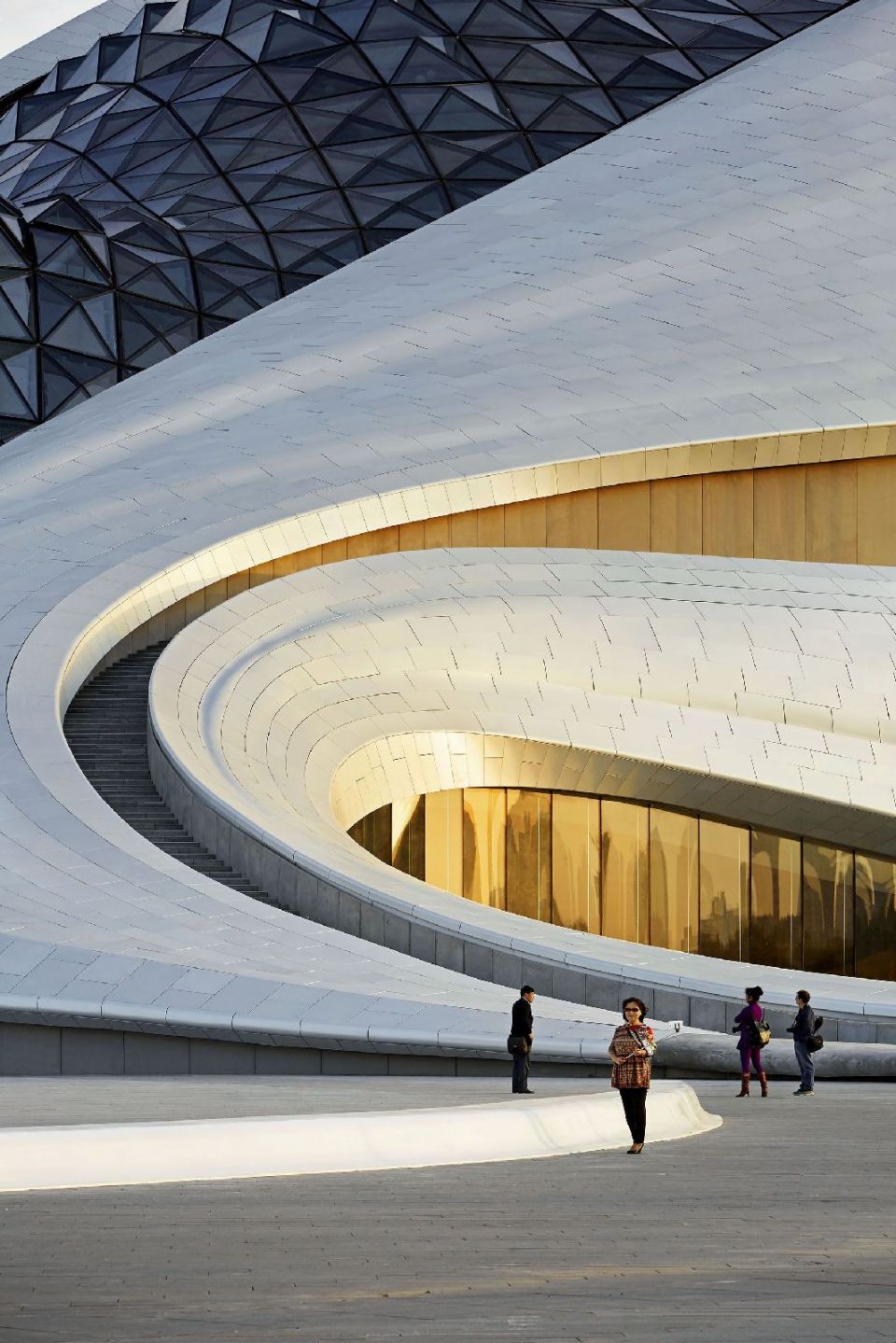 Pastatui grubumo ir jėgos suteikia kreivinis fasadas, sudarytas iš lygių baltų aliuminio plokščių, kurios persipynusios tampa krašto ir paviršiaus poezija, minkštumu ir ryškumu. Kelionė prasideda kertant tiltą į Harbino kultūros salą, kur banguojanti architektūrinė masė supa didelę viešąją aikštę, o žiemos mėnesiais panyra į snieguotą žiemos aplinką.