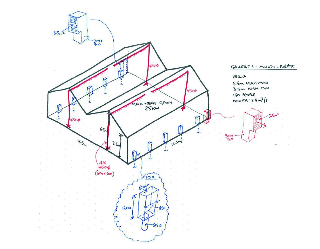 Vietomis muziejaus patalpų lubos siekia 6–8 metrus aukščio. Šios patalpos grynu oru aprūpinamos pasitelkus išstumiančiosios ventiliacijos principą. Oras iš vėdinimo sistemos į patalpas tiekiamas tam tikra altitude: nuo grindų iki 2 metrų aukščio zonoje oro kokybė griežtai reguliuojama, o aukščiau ji nėra kritiškai svarbi. Šis vėdinimo būdas muziejui yra ženkliai ekonomiškesnis, o svarbiausia – visada užtikrins labai gerą klimatą.