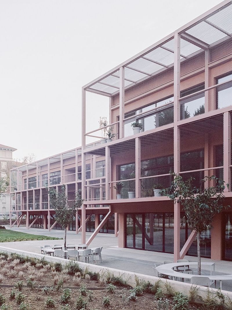BDR biuras daugiausia papildė esamas struktūras: nauja plieno konstrukcija sukuria pastato „voką“, kuriame terasos, neatsiejama mokyklos dalis, apima naujas jungiamąsias erdves ir veikia kaip pasyvus skydas. Naujojo rėmo moduliškumas, išryškinantis sriegį primenantį stuburą, užpildytas metalinio tinklo, kuris pabrėžia vizualų pralaidumą ir santykį su išore.