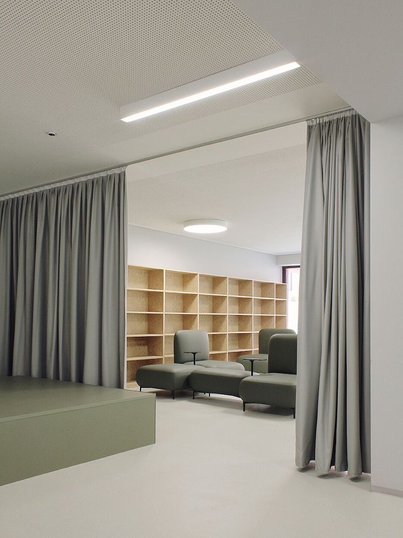 Pirmasis aukštas suprojektuotas kaip visuomeninis centras – jo atrijaus jungtis su sodu ir dviem įėjimais užtikrina daugiafunkciškumą. Ši visą pastatą jungianti erdvė kyla į viršutinius aukštus per vertikalų elementą – laiptus. Lanksti bibliotekos ir auditorijos zona, kavinė ir sporto salė užbaigia viešąsias pirmo aukšto erdves.