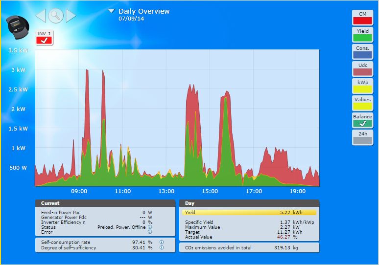 UAB „Solet Technics“ šiam uždaviniui pasitelkė nebrangią, bet patikimą vokiečių „SolarLog“ fotovoltinių elektrinių monitoringo sistemą. Ji suderinama su praktiškai visais žinomais inverterių gamintojais. Nors pagrindinė sistemos funkcija – gamybos duomenų surinkimas, pateikimas ir atvaizdavimas vartotojui draugiška forma internete, pasitelkus papildomą skaitiklį naudojamos energijos kiekiui apskaičiuoti, ne tik valdo inverterių darbą atsižvelgdama į naudojimą, bet ir leidžia vartotojui į ataskaitas integruoti naudojimo duomenis kartu su gamybos duomenimis. Paveikslėlye galima matyti, kaip faktiškai valdoma: rausva spalva pavaizduoti naudojimo duomenys, žalia – gamybos.