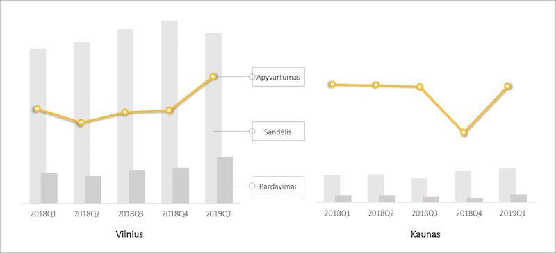 Vilniuje kol kas sparčiai auga paklausa, sandėlis smarkiai nesipučia, bet konkurencija – intensyvi. 2018–2019 m. vidutinis apyvartumas per ketvirtį sostinėje yra apie 17 proc. Jis smarkiai ūgtelėjo pirmąjį šių metų ketvirtį (iki 21,4 proc.; pardavimų buvo 1 562, sandėlis – 5 747), o iki tol metus laikėsi labai stabiliai – apie 16 proc.