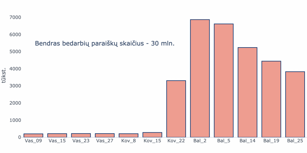 Išaugęs nedarbo lygis priverčia amerikiečius masiškai atsidėti paskolų mokėjimus. Vien tik JAV Mičigano valstijoje daugiau kaip 1,2 milijono žmonių šiuo metu yra bedarbiai, o tai atspindi 25% nedarbo lygį šioje valstijoje. JAV per 2020 m. balandžio mėnesį daugiau kaip 30 milijonų amerikiečių pateikė vadinamąsias bedarbių paraiškas, kas reiškia, kad jie neteko darbo (1 pav.).