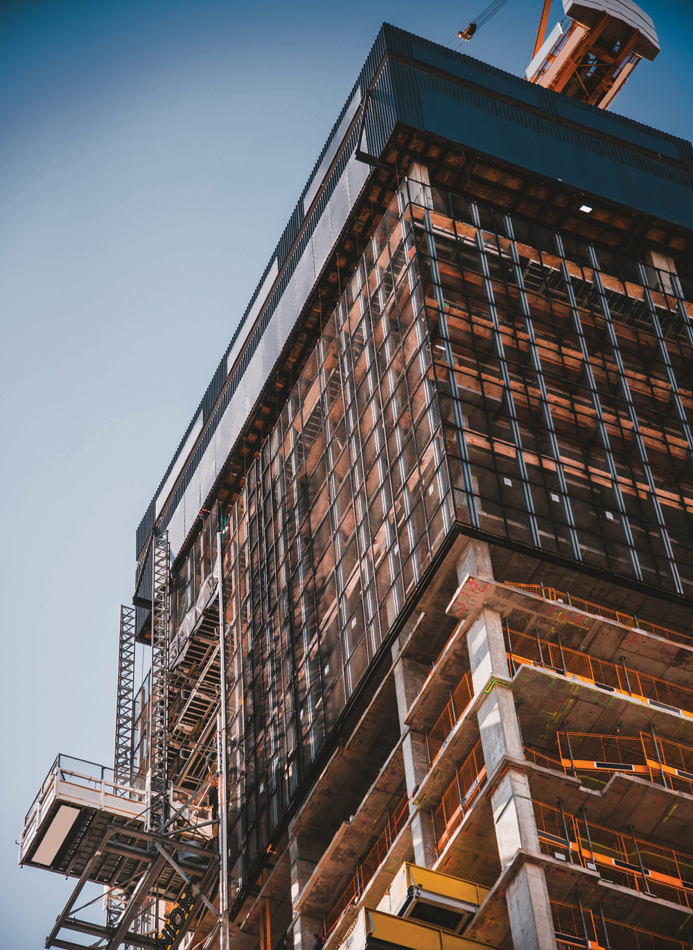 Daugiaaukščių pastatų statyboje naudojama daug plieno, bet greta stovintys pastatai apriboja statybų ir medžiagų sandėliavimo plotą, be to, taupomas suvirintojų darbo laikas, taigi plieno karkasai gaminami tokių formų ir dydžių, kad juos tereikia atvežti į statybvietę, užkelti ir sumontuoti. Jei naudojamos plieno kolonos, kiekviena į reikiamą vietą užkeliama kranu iki suvirintojams reikalingo aukščio. Stiklo panaudojimas pastatų fasadams taip pat labai populiarus, bet stiklas yra sunki medžiaga – jai kelti būtinas galingas kranas. Stiklo fasadai taip pat surenkami gamykloje, o statybvietėje jie pakeliami kranu ir sumontuojami ant karkaso. Toks montavimas paprastesnis, o darbo sąnaudos mažesnės. Statybos objekte gatavų fasado elementų montavimas apie dešimt kartų mažiau imlus darbo sąnaudoms ir daug spartesnis nei tradicinio fasado.