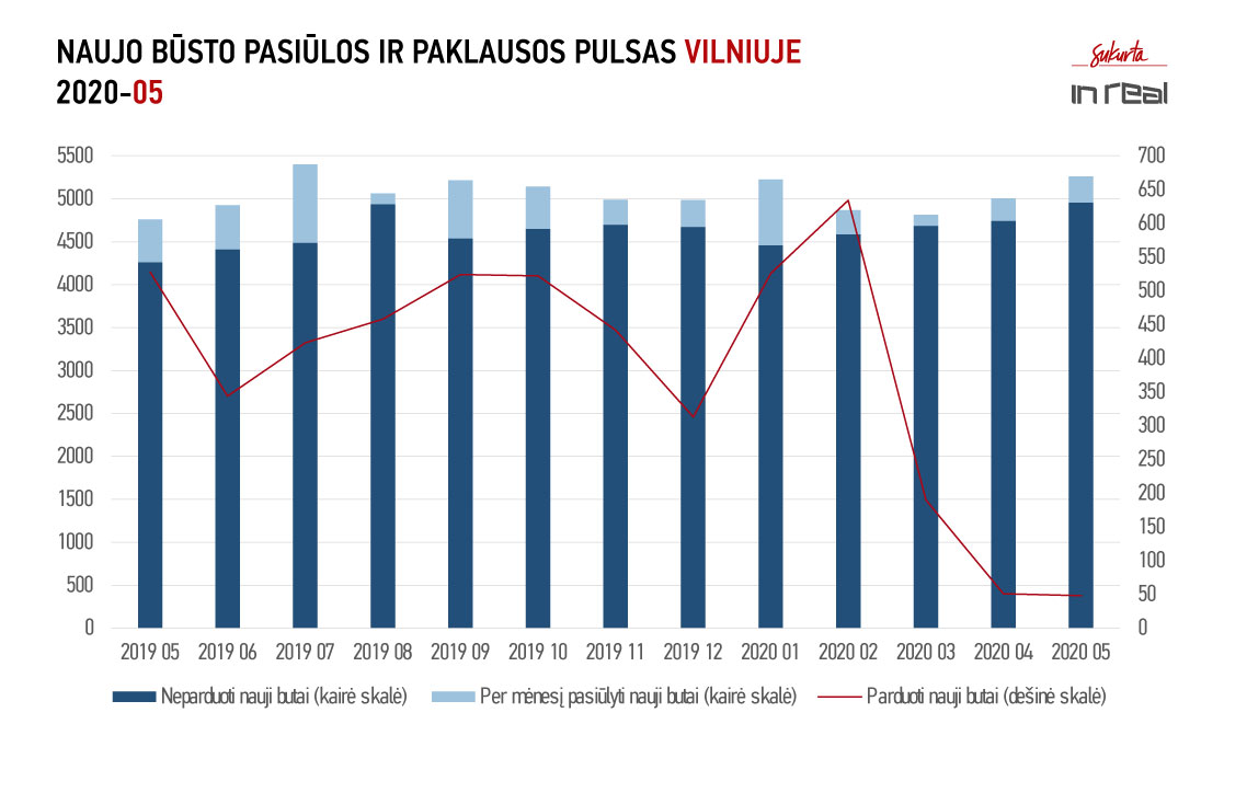 „2020-ųjų gegužė buvo išties įdomus mėnuo pirminei būsto rinkai. Nors suminiai rezultatai yra labai panašūs kaip ir balandžio mėnesį, tačiau reikšmingai pasikeitė rodiklių dedamosios. Visų pirma, atšaukimai susikoncentravo pavieniuose projektuose. Naujų projektų įvedimas į rinka paskutiniais mėnesiais egzistuoja tik Vilniuje, tad formaliai sostinėje būsto sandėlis auga ir toliau. Kita vertus, dalis plėtotojų pristabdė naujų, jau paskelbtų ir „iš brėžinių“ parduodamų projektų vystymą, tad realus būsto pasirinkimas mažėja“, – teigia „Inreal“ investicijų ir analizės vadovas Tomas Sovijus Kvainickas. Pasak jo, kol kas anksti koreguoti sandėlio rodiklius dėl tokių pristabdytų projektų, nes jų paruošiamieji darbai atlikti, tereikia pradėti statyti, tad sandėlio dydis ateityje priklausys nuo bendros ekonominės situacijos.