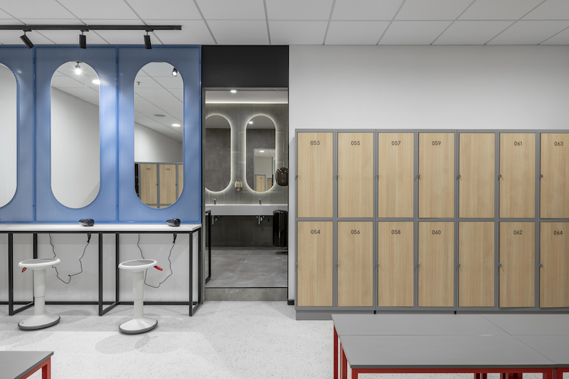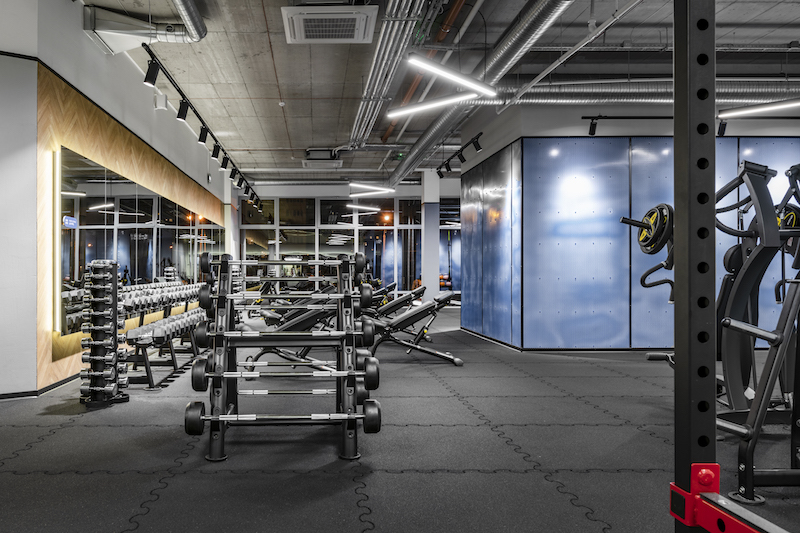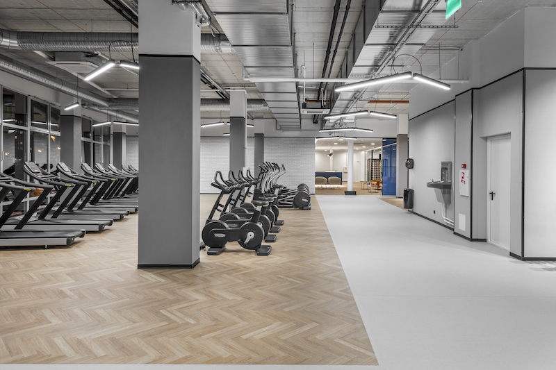 „Rinkdamiesi medžiagas, pirmiausia kreipėme dėmesį į jų praktiškumą, po to – į kontekstą. Beveik visoms erdvėms rinkomės PVC grindų dangas, tik derinome skirtingus raštus. Taip treniruoklių erdvėje atsirado artimiausia betono paviršiui pilkšva danga, kuri kartu su paliktomis atviromis betoninėmis lubomis kuria industrinį įspūdį. Atsverti pilkam betonui ir grubioms konstrukcijoms naudojome medžio rašto paviršius, o, kad kontrastas būtų dar išraiškingesnis, rinkomės eglutės klojimo principą. Taip, naudodami skirtingas dangas, atskyrėme treniruoklių zonas – kardiozoną bei tempimo zoną. Sunkiųjų svorių zona buvo klota specializuotomis juodos gumos plytelėmis, o viduryje jos esanti evakuacinė kubo formos laiptinė buvo panaudota kaip interjero detalė, kurią baldus sporto klubui gaminę „Woodiamo“ apdengė mėlynos spalvos perforuotu metalu. Mėlyna spalva ir perforuoti metalai taip pat buvo naudojami rūbinėse bei recepcijos balduose. Kontrastui sustiprinti ir industrijos grubumui priminti naudojome baltas dekoratyvines plytas, kurių faktūrą išryškinome šviesos diodų (LED) apšvietimu“, – pasakoja dizainerė ir čia pat džiaugdamasi priduria, kad užsakovai neišsigando naudoti eglutės rašto medžio imitacijos dangų treniruoklių salėje, ypač ant sienos prie sunkiųjų svorių, nes tai buvo visiškai netradicinis sprendimas.
