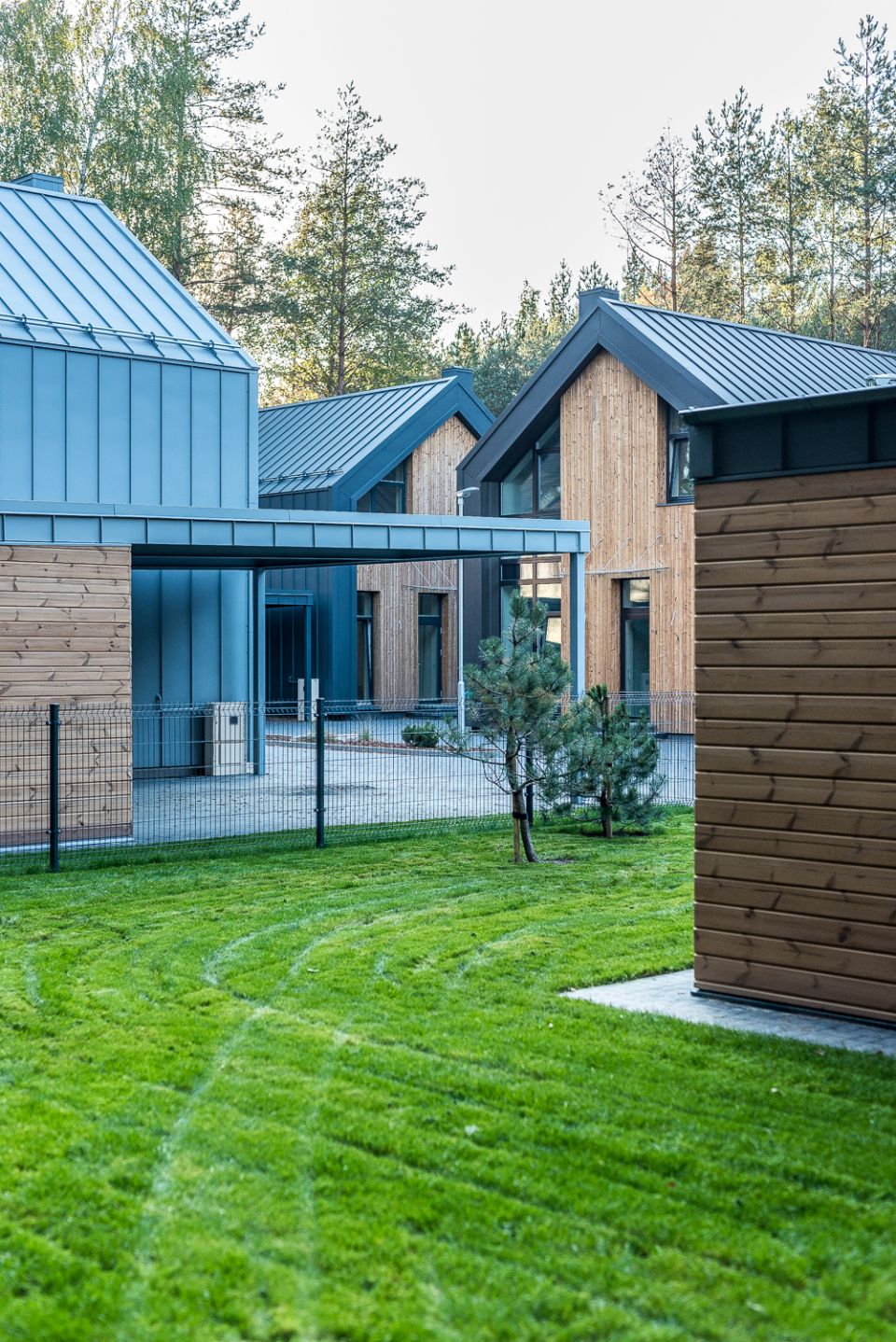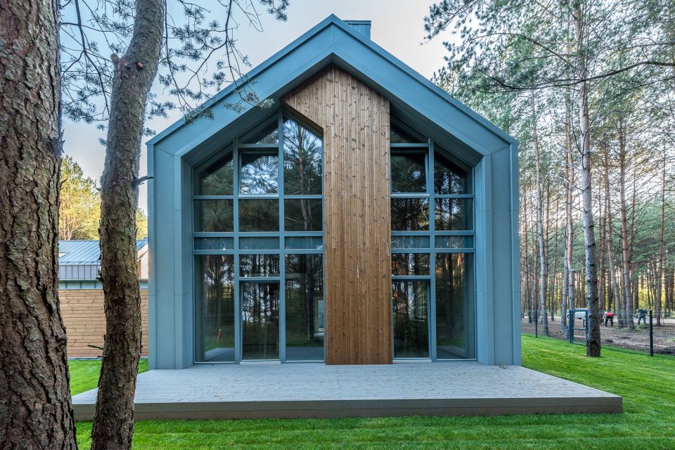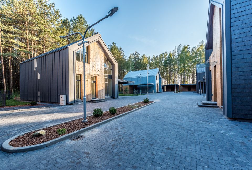 Visų aštuonių inovatyvių namų, kurių kiekvieno plotas 130 m2, gręžtiniai pamatai ir monolitinis gelžbetonio rostverkas apšiltinti putų polistirenu. Fasado ir stogo apdailoje dėmesį patraukia medis, taip pat naudotos aukščiausios klasės „Classic“ skarda. Stogas apšiltintas akmens vata ir poliuretano plokštėmis. Tiesa, du namukai yra itin unikalūs – jų stogas ir fasadas suformuoti iš skalūno! Išorinės sienos išmūrytos iš keraminių plytų. Anot „Constra“ direktoriaus Slavomiro Volkovo, nors darbas su šia medžiaga kartais užtrunka ilgiau, ją naudoti verta dėl kokybės ir ilgalaikiškumo faktoriaus.