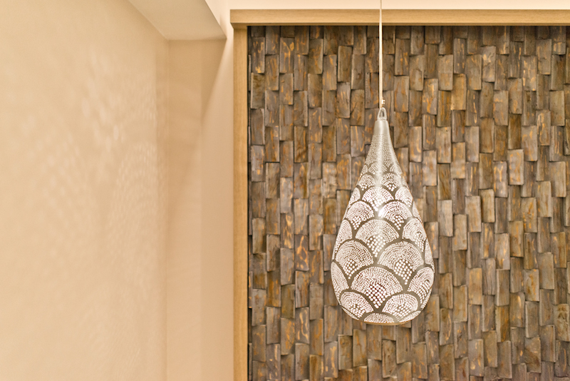 Beveik visos interjero detalės, apdailos medžiagos atplaukė iš Balio salos – viešbučio „Flores“ ir SPA centro statytojai jas užsakę laukė metus, kol viskas saugiai pasiekė Klaipėdos uostą, o tada jau sausumos transportu – Druskininkus. Nemaža dalis elementų (apie 70 %), suteikiančių interjerui pagrindinį akcentą, buvo užsakomi individualiai. Pavyzdžiui, kiekvieno kambario numeris papuoštas jostro žiedu. Kiti interjero sprendimai – lovų galvūgalių mozaikos ir smiltainio kompozicijos, mediniai pano ant sienų, V formos kriauklės, vienaluičio marmuro vonios, dievybių figūros, plono metalo šviestuvai – buvo užsakyti iš Balio amatininkų. Kambarių interjerą organiškai papildo iš bananų lapų ar nendrių supinti kilimai. Žiemos sodo juodoji siena pagaminta iš lavos – Rytuose tikima, kad lavos gaminiai neša laimę. Marmuriniuose vonios kambariuose dėmesį traukia ypatingų formų kriauklės, išskaptuotos iš marmuro arba itin tvirto medžio, šimtmečius išgulėjusio žemėje. Nepaprastas iššūkis buvo perteikti kuo stipresnį tėkmės ir nuoseklumo potyrį SPA centre. Unikaliai procedūrų erdvei būdingos gamtiškos formos – čia sienos išsiskiria verstos odos faktūros efektu, architektūriniu aptakumu, dideliu atviros erdvės plotu, jaukiu apšvietimu, kuriamu rytietiškų motyvų ažūriniais šviestuvais, pro kuriuos sklindanti šviesa ant sienos suformuoja ornamentą.