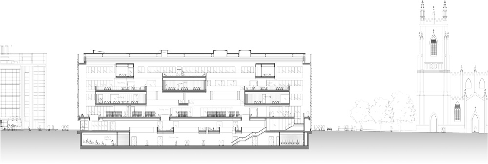 Per stoglangius sklindanti dienos šviesa užlieja visą pastato vidų, o per stiklinius antro aukšto atrijuje esančių, pagal užsakymą pagamintų darbo stalų centrus šviesa patenka į pirmą aukštą ir pusrūsį, stiklas taip pat padeda izoliuoti garsą. Pusrūsyje įrengtose auditorijose iš viso gali tilpti 1 500 žmonių, didžiausioje iš jų – 400.
