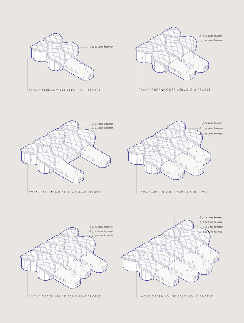 Kadangi kiekvienam asmeniui reikia 40 metrų kvadratinio šiltnamio ploto, kad užaugtų pakankamai maisto ir išlaikytų savarankiškumą, dizainerė sukūrė skirtingas potencialias tipologijas, pagrįstas dviejų, trijų ir keturių asmenų šeimos šiltnamių struktūromis.