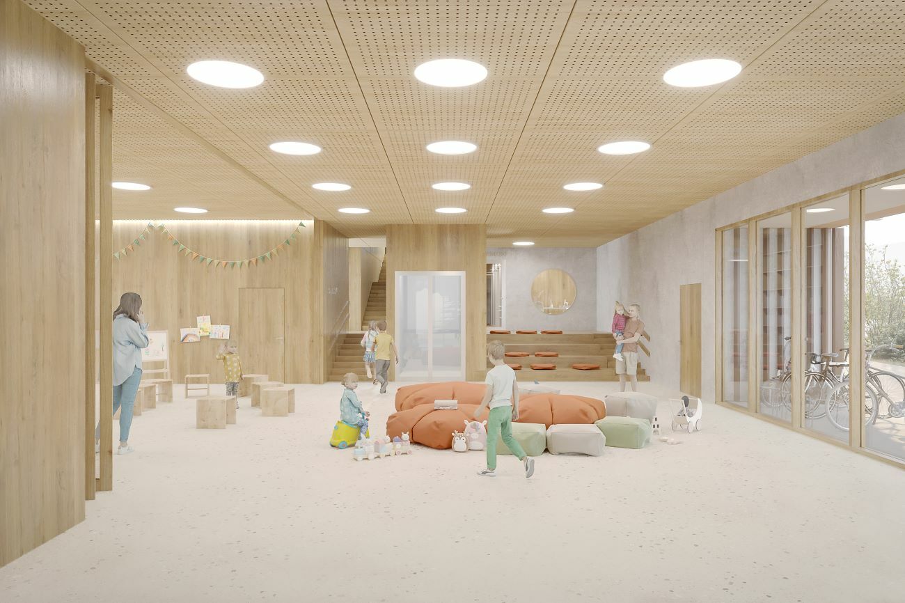 Teritorijoje bus išsaugoma dalis esamų medžių, tarp išsaugomų ir naujai sodinamų medžių grupių formuojamos pagrindinės žaidimų aikštelių zonos, o išilginta struktūra leis išlaikyti maksimaliai žemą pastato tūrį.