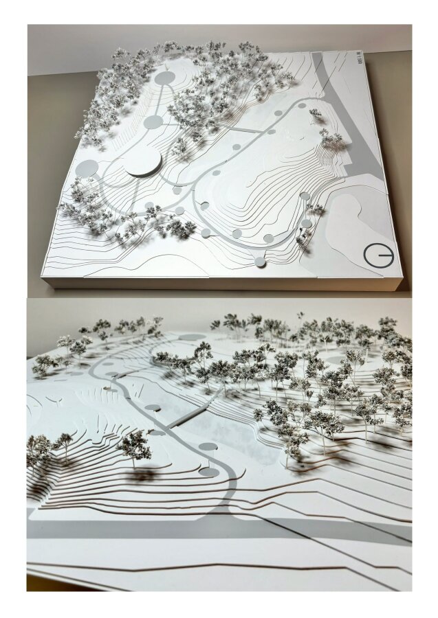 Naujo pastato vieta sklype buvo pasirinkta atsižvelgiant į jau susiklosčiusią situaciją ir stengiantis ne keisti, o patobulinti ir papildyti esamą erdvinę sandarą. Pastato stogas, nuleidžiamas ant žemės. Taip jis susilieja su esamu kraštovaizdžiu, o tolimesnė dalis kyla link žemyn besileidžiančio šlaito – kuriama nenutraukiamo kraštovaizdžio regimybė su plačiai atsiveriančiomis vidaus erdvėmis į priešingą pusę. Šis sprendinys leidžia lankytojams užlipti tiesiai nuo tako ant žaliojo stogo, iš kurio atsiveria išskirtinė galimybė apžvelgti aplinką ir pačią EGC aikštę.