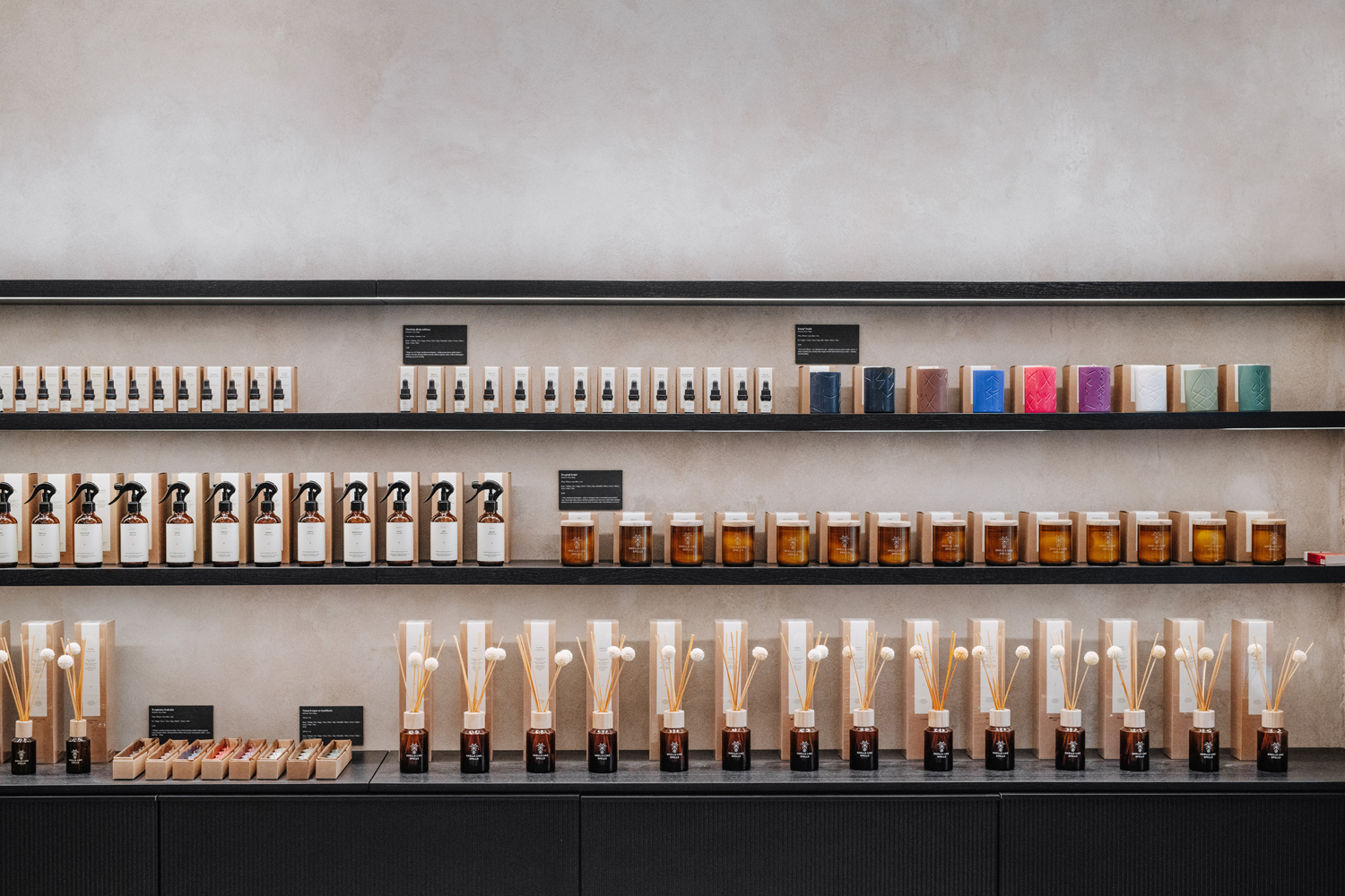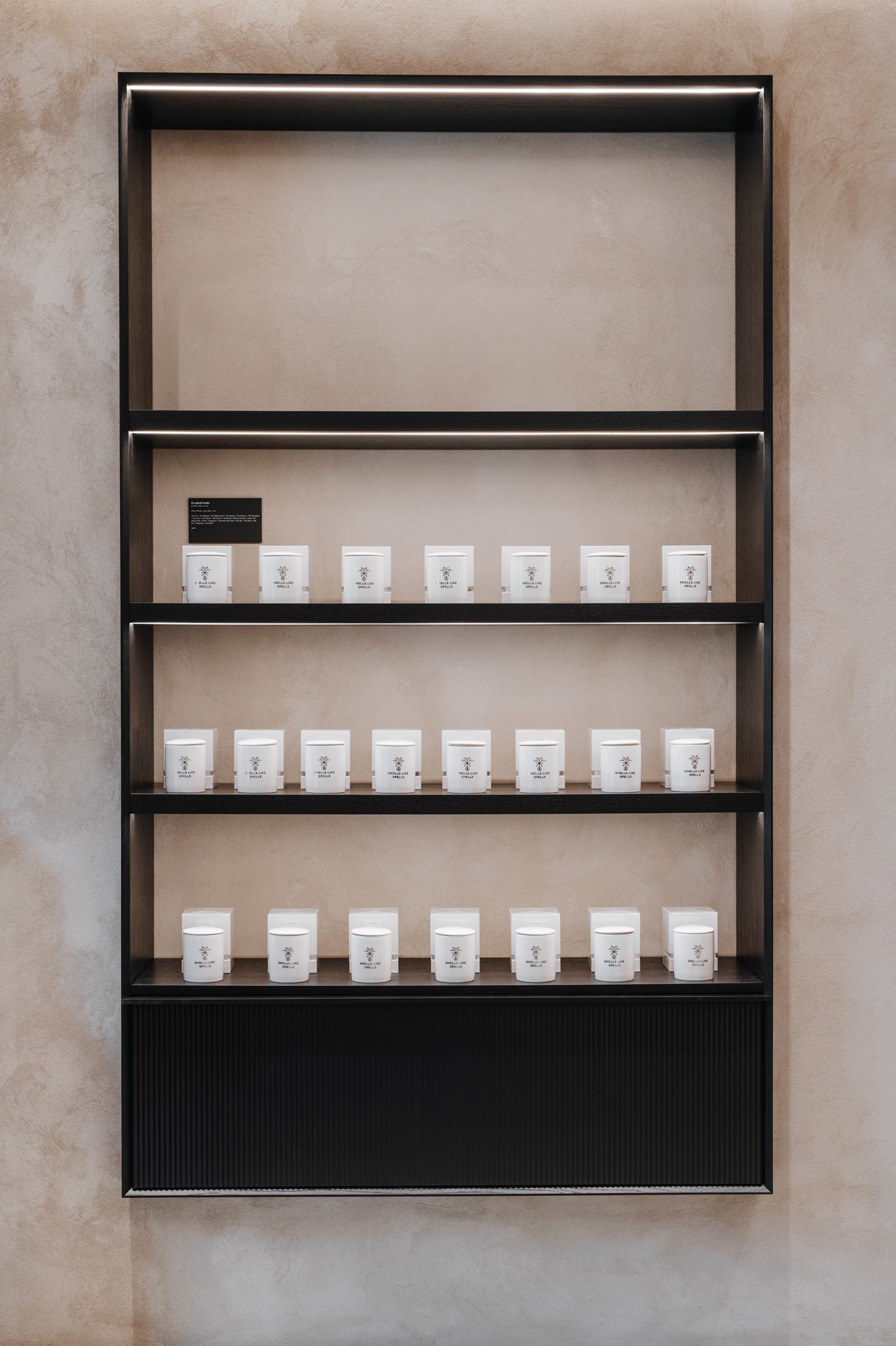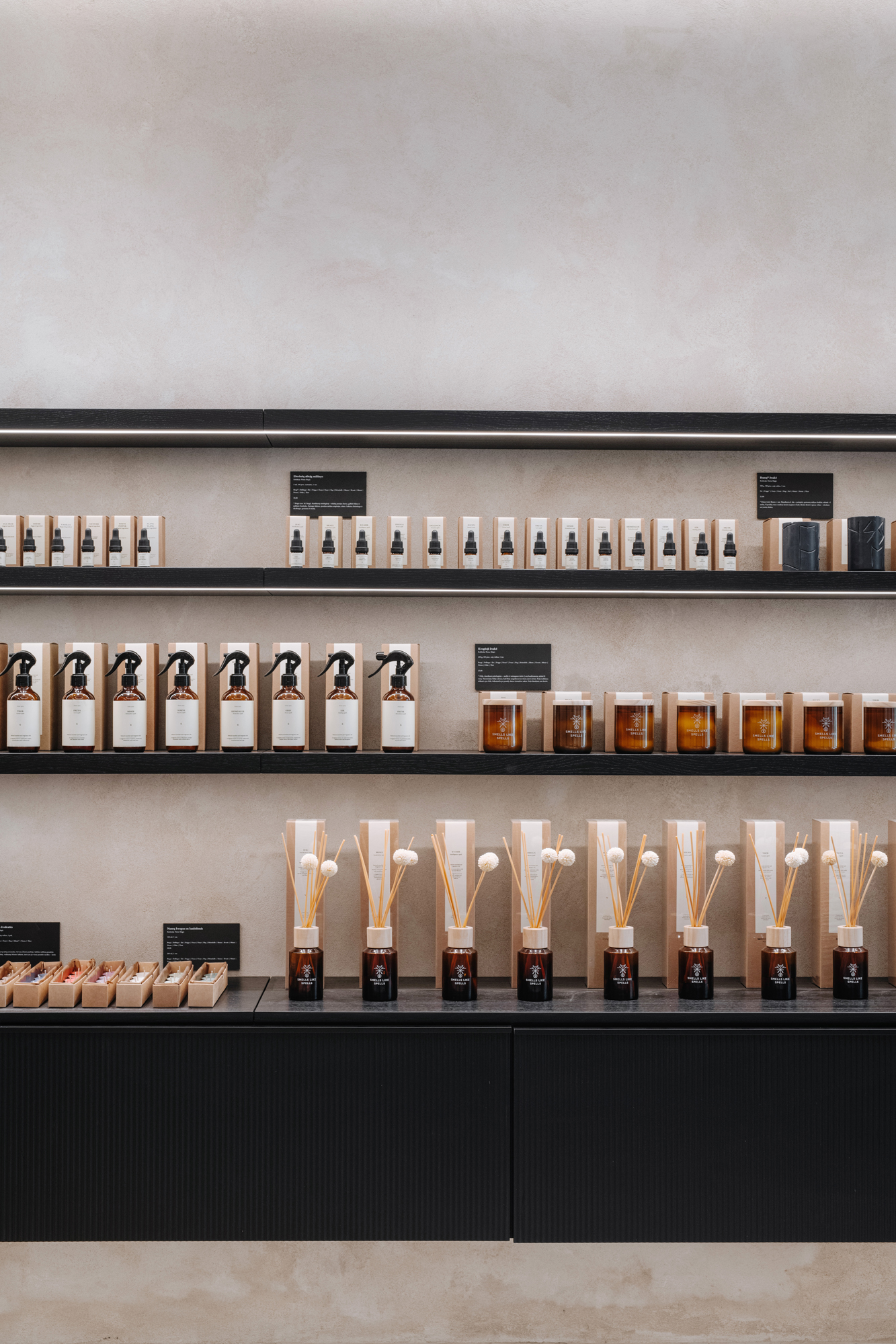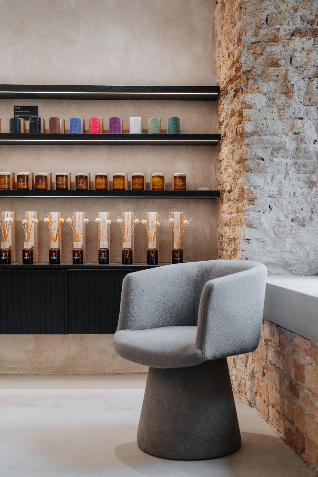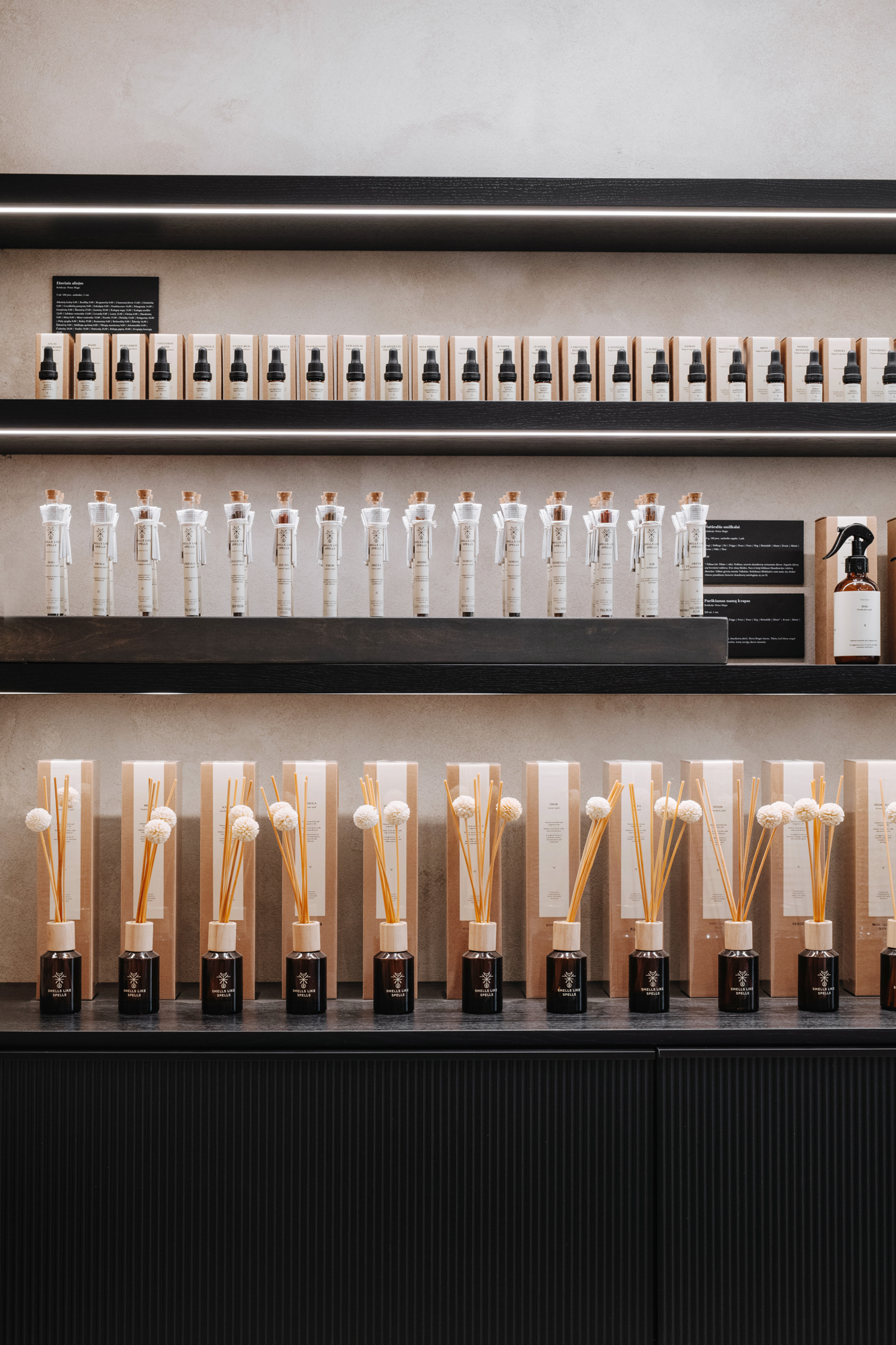 Parduotuvės zona alsuoja moderniu švarumu: akmens masės recepcijos stalas, minimalistinės lentynos kuria išskirtinės estetikos pojūtį. Visa ekspozicija išdėstyta tarsi parfumerijos meno muziejuje. Itin kruopščiai apgalvota vizualinė kompozicija – nuo pakuočių kolorito iki apšvietimo kampo – suteikia daiktams laisvę reikštis. Kiekvienas kvapas čia turi ne tik aromatinę, bet ir erdvinę ekspresiją.