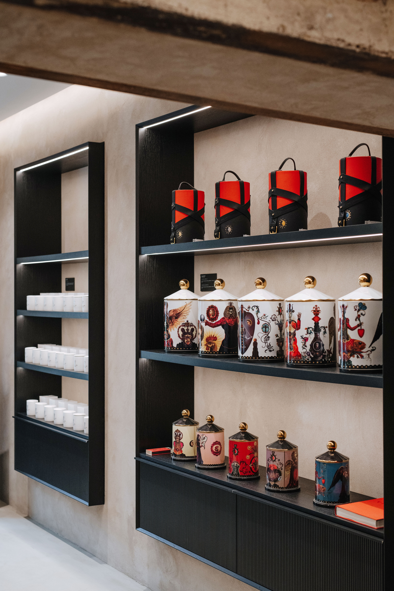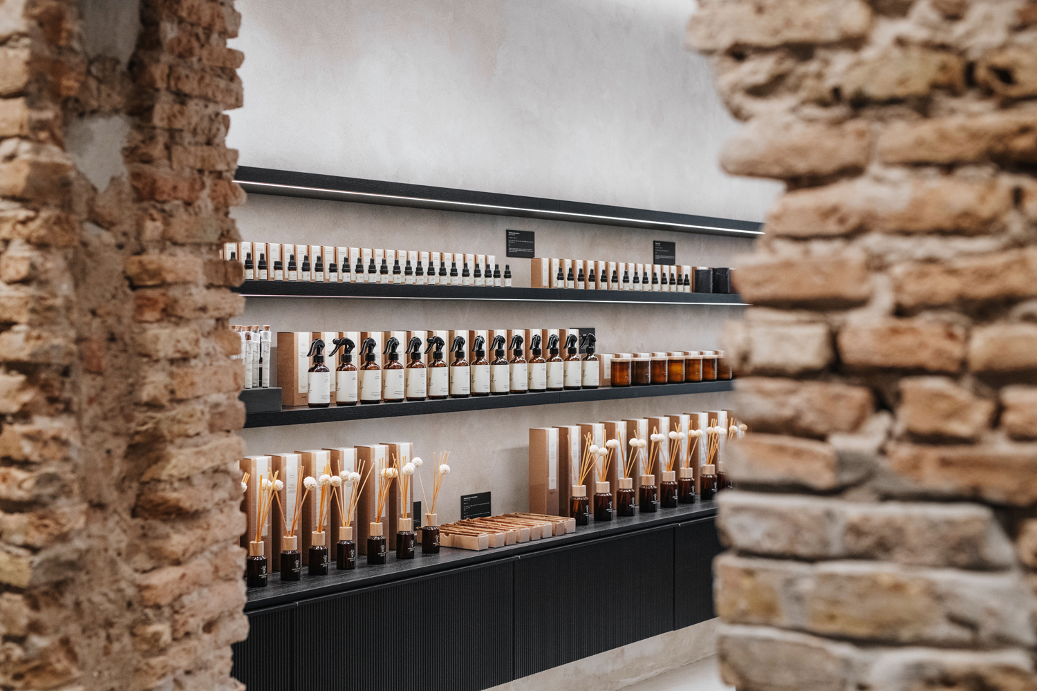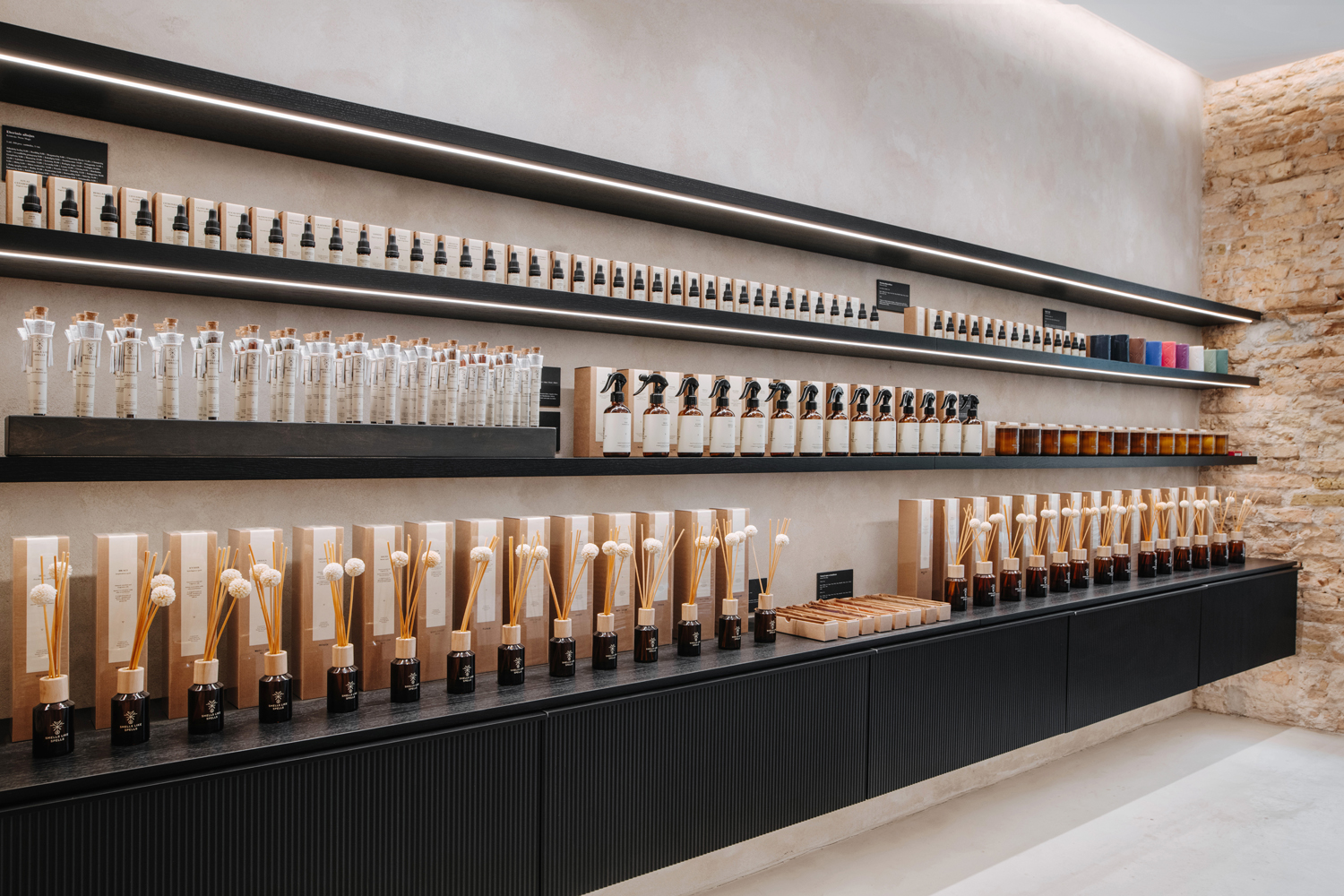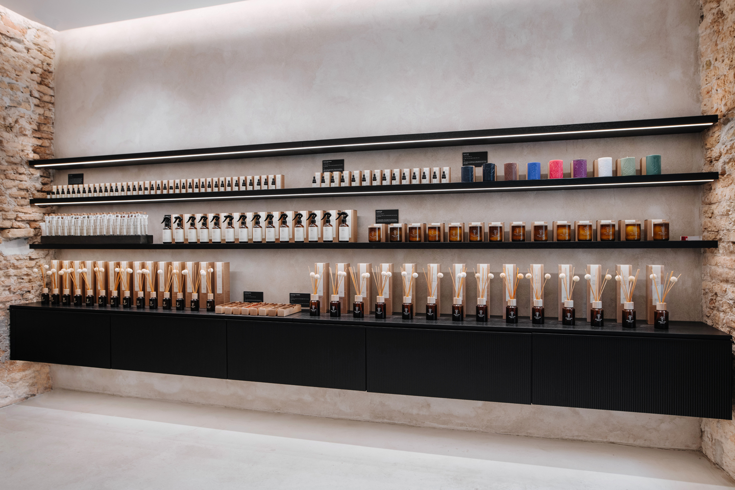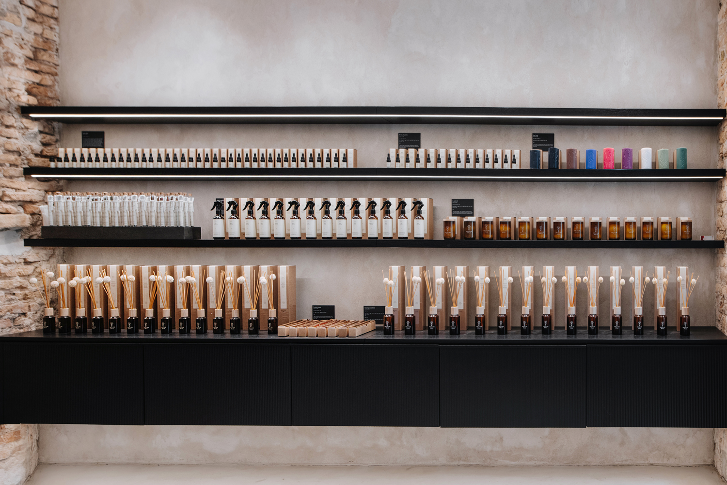 Parduotuvės zona alsuoja moderniu švarumu: akmens masės recepcijos stalas, minimalistinės lentynos kuria išskirtinės estetikos pojūtį. Visa ekspozicija išdėstyta tarsi parfumerijos meno muziejuje. Itin kruopščiai apgalvota vizualinė kompozicija – nuo pakuočių kolorito iki apšvietimo kampo – suteikia daiktams laisvę reikštis. Kiekvienas kvapas čia turi ne tik aromatinę, bet ir erdvinę ekspresiją.