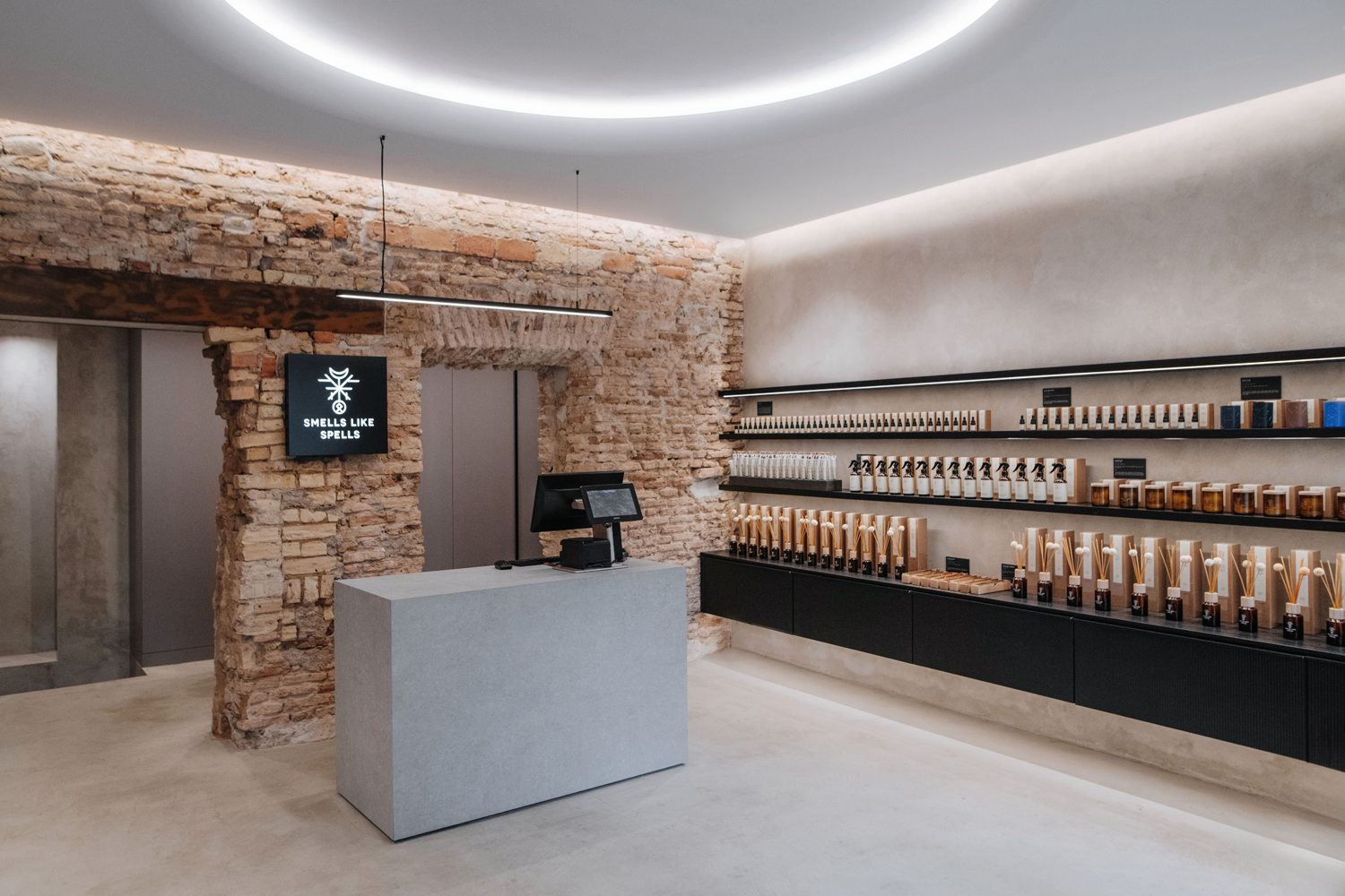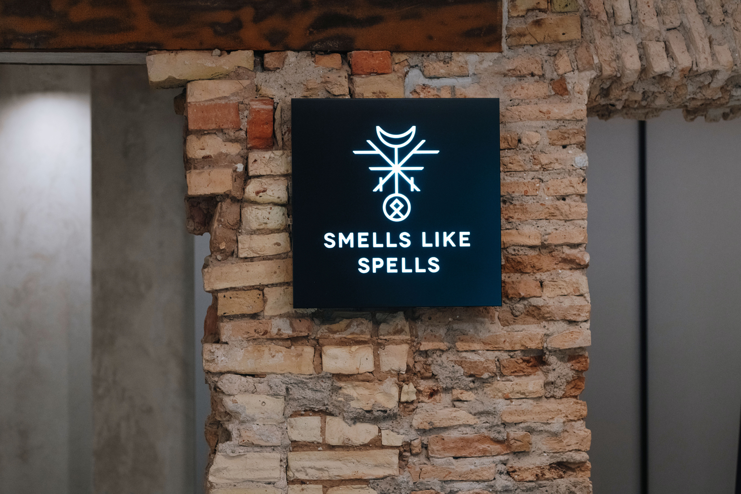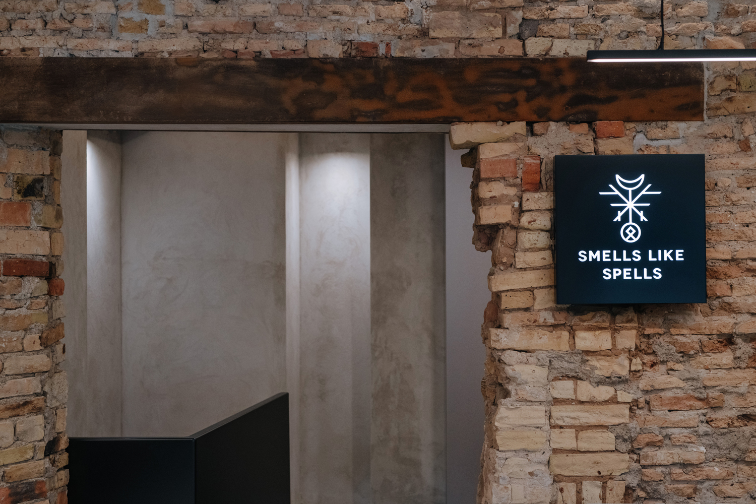 „Smells Like Spells“ parduotuvės interjeras – subtili elegancijos ir rafinuoto minimalizmo dermė, čia praeitis susitinka su šiuolaikišku dizainu. XVI–XVIII a. plytos, betono intarpai, sovietmečio sluoksniai ir net nežymūs griuvimo ženklai sukuria autentišką, istorinę atmosferą, kurios kontrastą išryškina modernios betono detalės ir griežtos geometrinės formos.