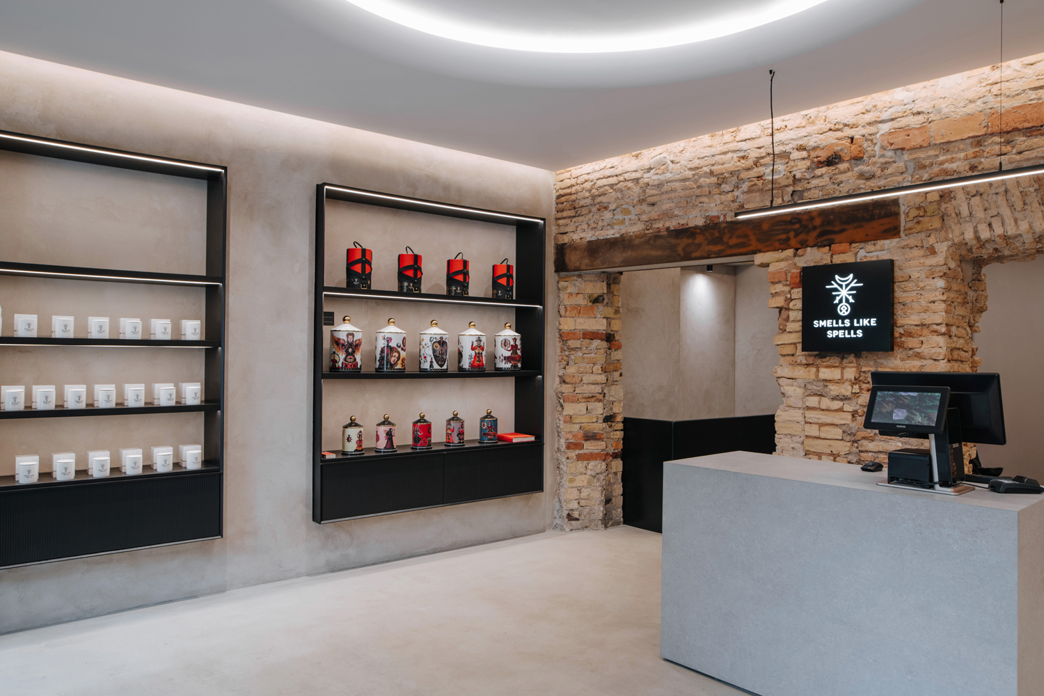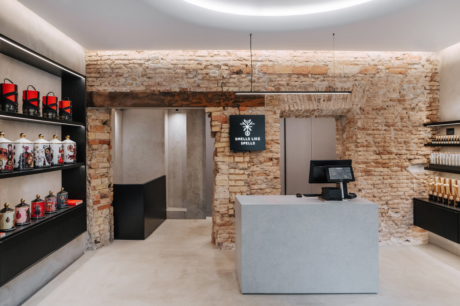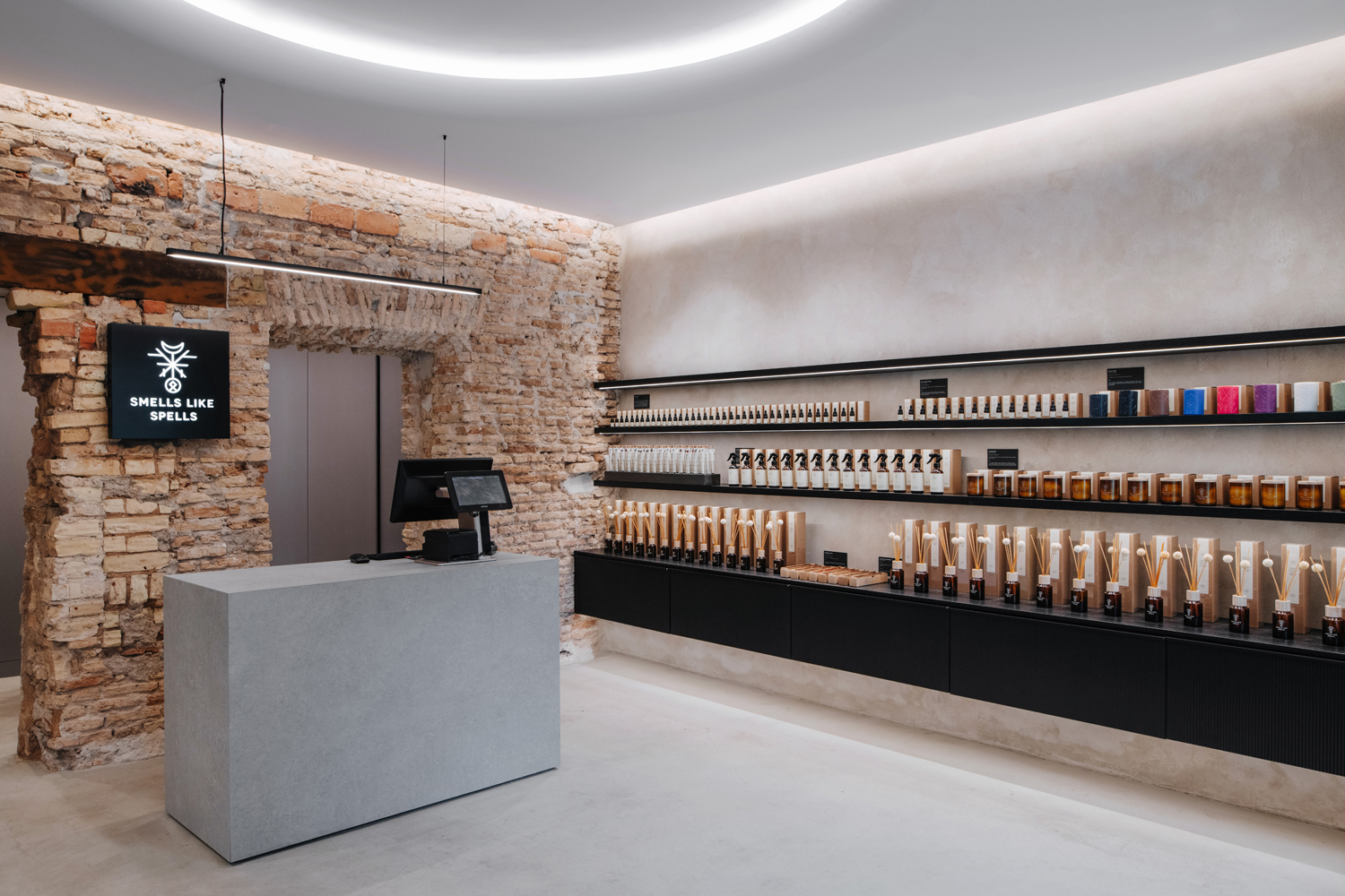 „Smells Like Spells“ parduotuvės interjeras – subtili elegancijos ir rafinuoto minimalizmo dermė, čia praeitis susitinka su šiuolaikišku dizainu. XVI–XVIII a. plytos, betono intarpai, sovietmečio sluoksniai ir net nežymūs griuvimo ženklai sukuria autentišką, istorinę atmosferą, kurios kontrastą išryškina modernios betono detalės ir griežtos geometrinės formos.