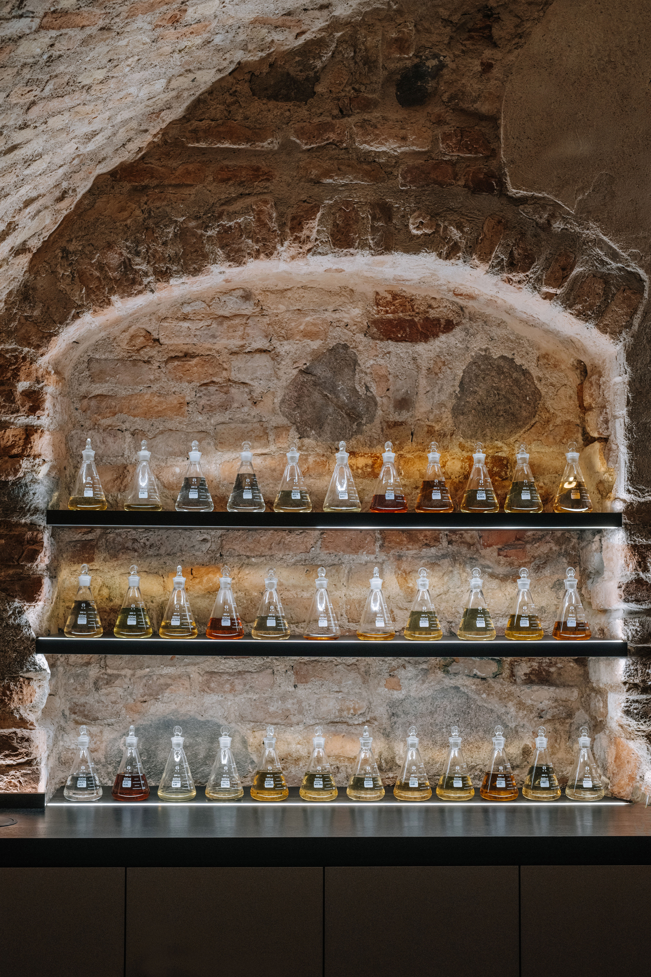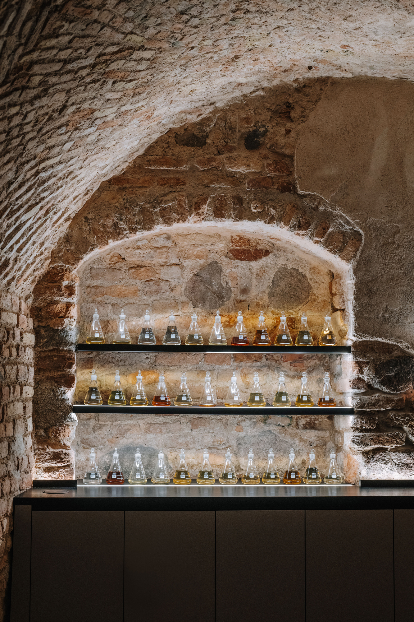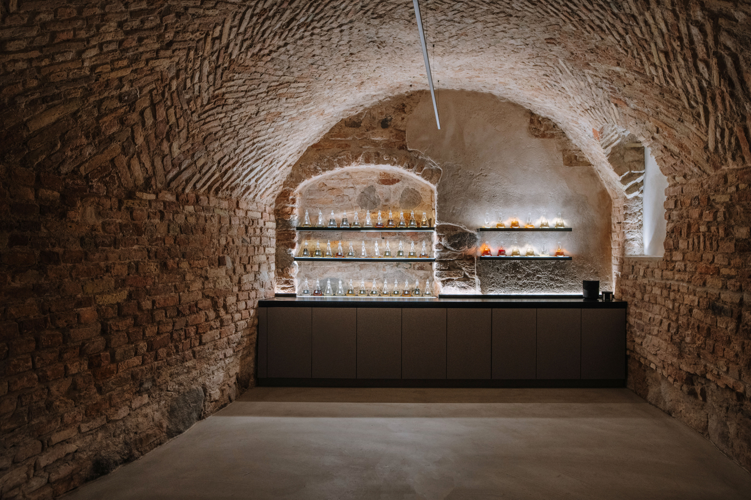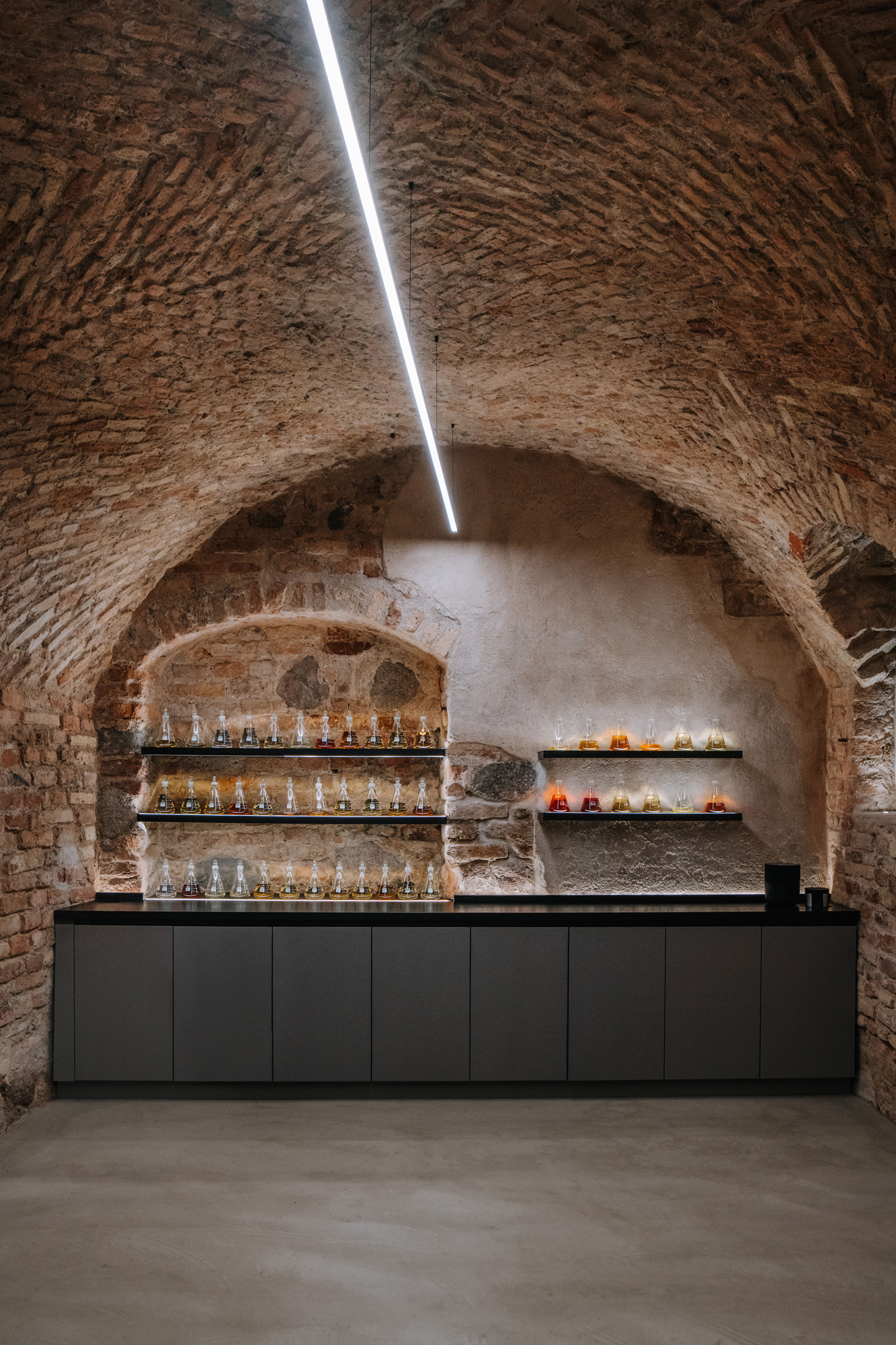 Natūralaus apšvietimo ir šviesos instaliacijų žaismas paryškina medžiagų charakterį, paversdamas kiekvieną kampą vizualiniu potyriu. Apšvietimas šiame interjere tampa nematoma, tačiau itin svarbia dramaturgijos dalimi – jis ne tik išryškina istorinių plytų faktūras ir šiuolaikinių paviršių švarą, bet ir kuria emocinį ritmą visoje erdvėje, kerinčioje natūraliu lėtumu. Čia nėra skubėjimo, stiliaus deklaracijų. Šioje parfumerijos kompozicijoje kiekviena nata žino savo vietą. Tačiau ši erdvė, kaip ir magiški kvapai, turi paslaptį – tunelį, apie kurį nėra nė vieno ženklo oficialiuose planuose ir žemėlapiuose. Jis tarsi slysta po pastatu, veda į kitas erdves, pasiklysta po Vilniaus grindiniu. Tai viena iš paslapčių, kurių nereikia iki galo paaiškinti – pakanka žinoti, kad jos yra.