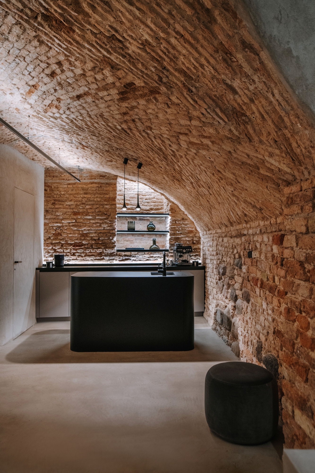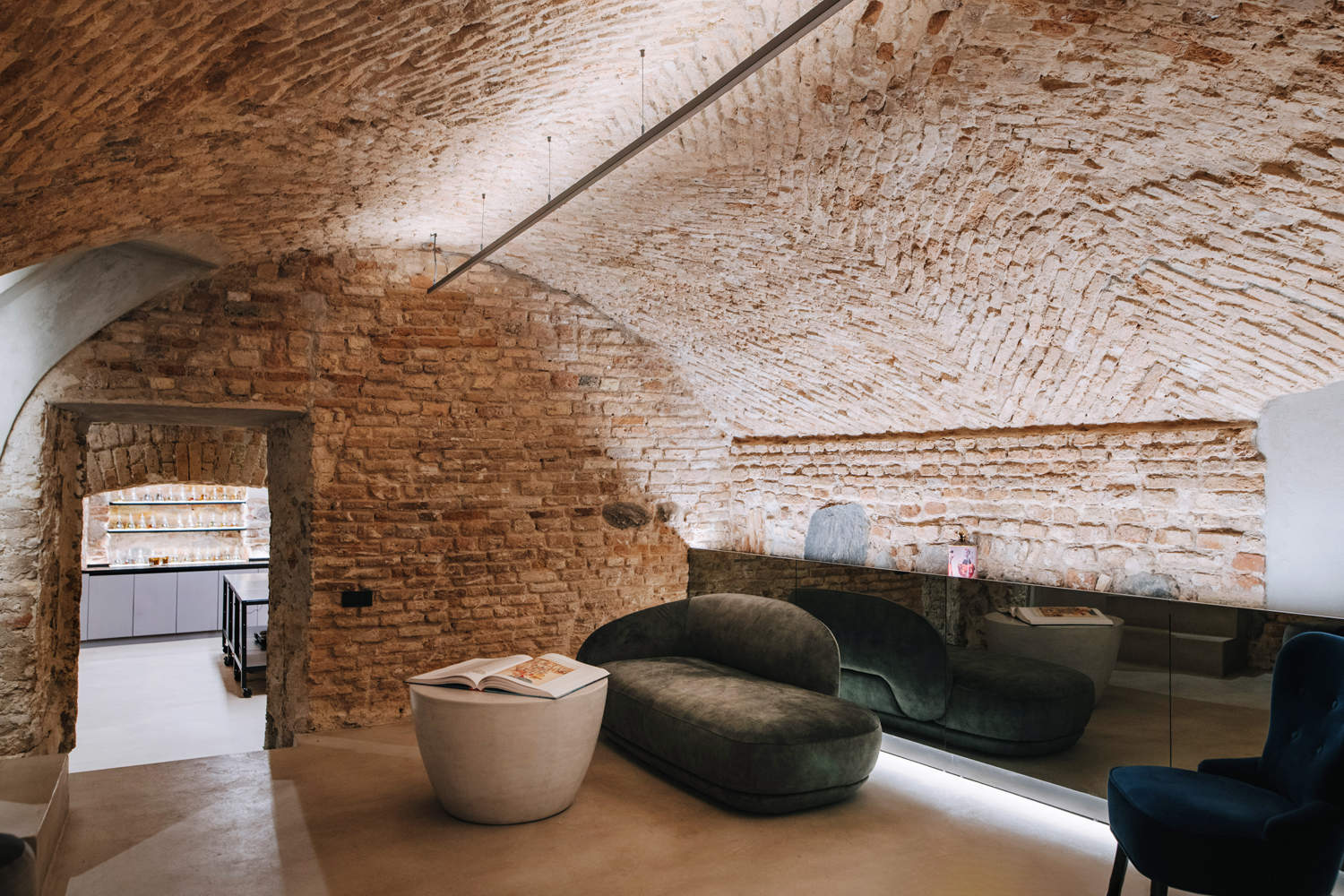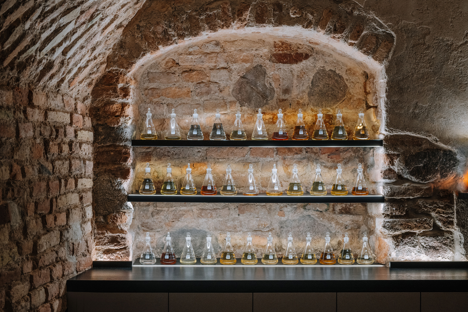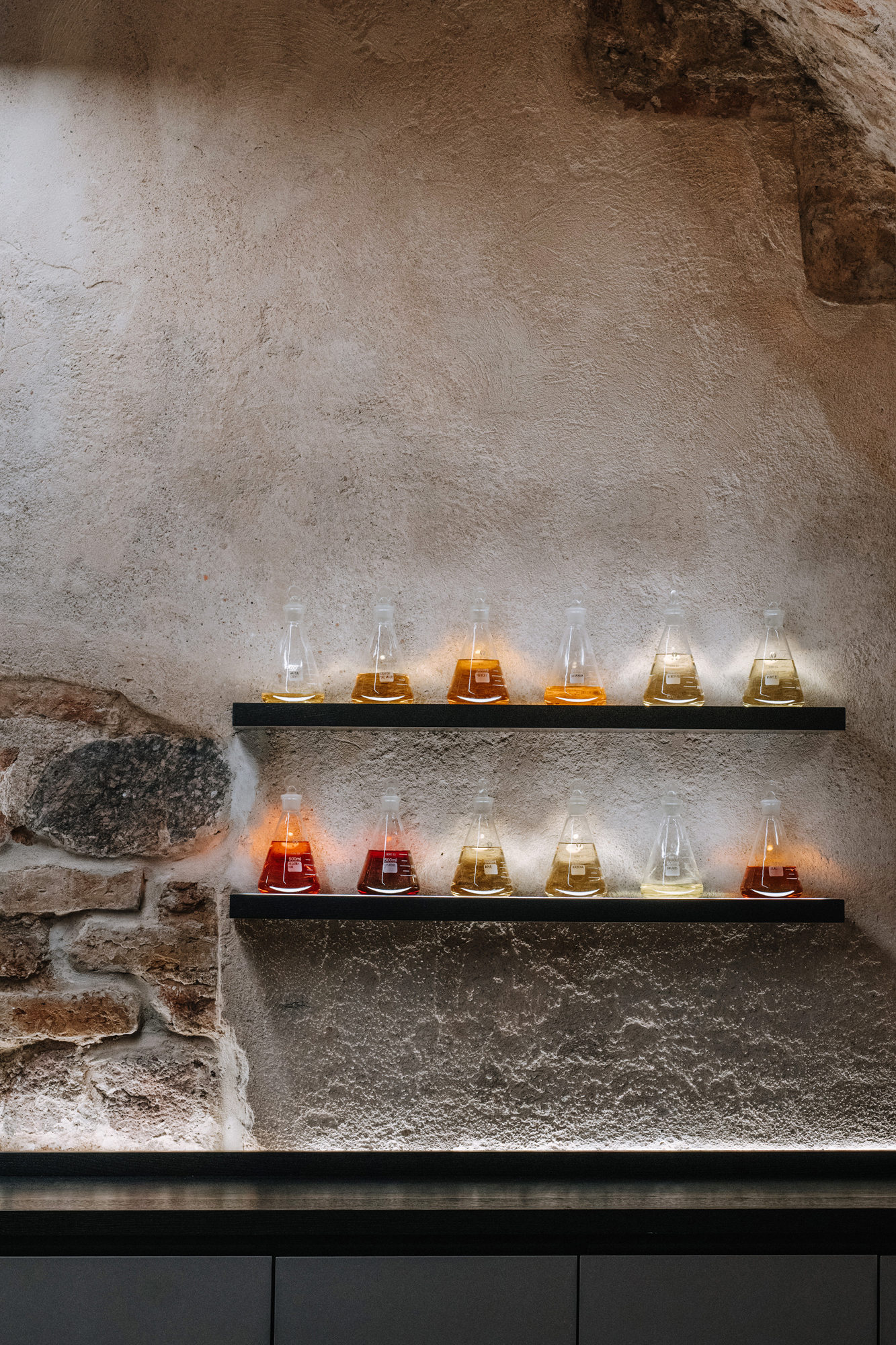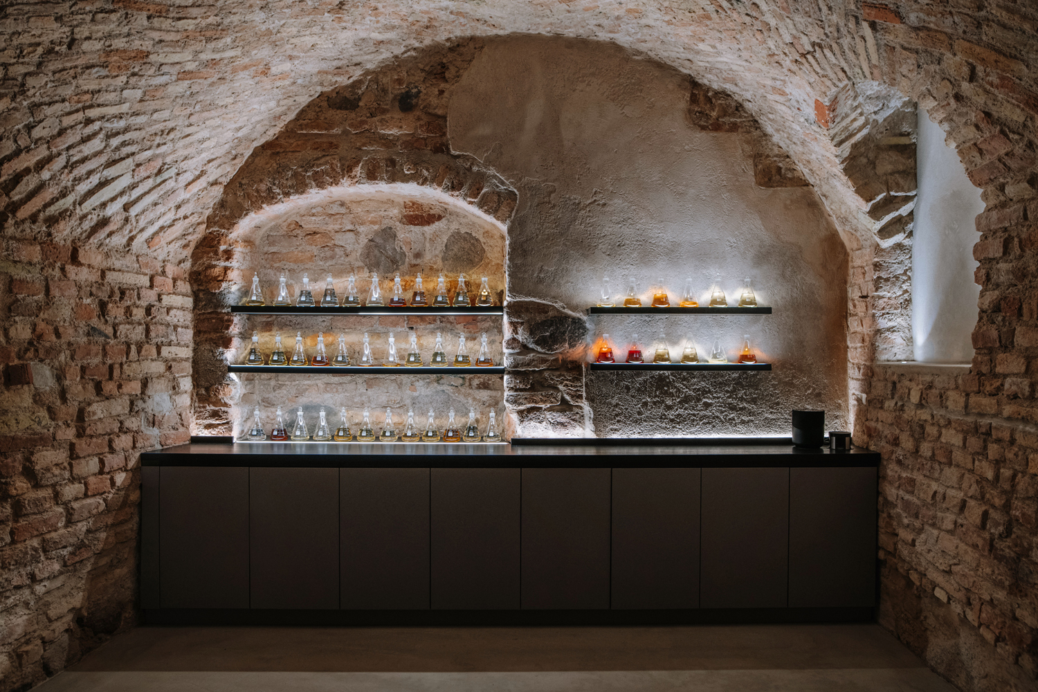 Natūralaus apšvietimo ir šviesos instaliacijų žaismas paryškina medžiagų charakterį, paversdamas kiekvieną kampą vizualiniu potyriu. Apšvietimas šiame interjere tampa nematoma, tačiau itin svarbia dramaturgijos dalimi – jis ne tik išryškina istorinių plytų faktūras ir šiuolaikinių paviršių švarą, bet ir kuria emocinį ritmą visoje erdvėje, kerinčioje natūraliu lėtumu. Čia nėra skubėjimo, stiliaus deklaracijų. Šioje parfumerijos kompozicijoje kiekviena nata žino savo vietą. Tačiau ši erdvė, kaip ir magiški kvapai, turi paslaptį – tunelį, apie kurį nėra nė vieno ženklo oficialiuose planuose ir žemėlapiuose. Jis tarsi slysta po pastatu, veda į kitas erdves, pasiklysta po Vilniaus grindiniu. Tai viena iš paslapčių, kurių nereikia iki galo paaiškinti – pakanka žinoti, kad jos yra.